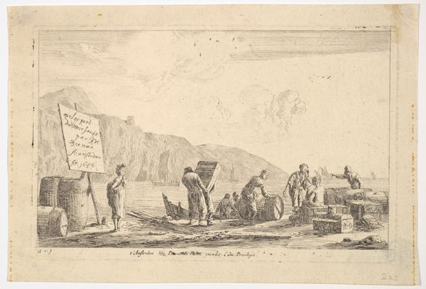 This print, "Fishermen with Catch on the Coast," was made by Jacques Philippe Le Bas in the 18th century. Notice how Le Bas arranges the figures and objects to create a sense of depth. The eye is led from the fishermen in the foreground towards the distant coastline. Linear perspective is used to create spatial organization. The composition is carefully balanced, with the figures clustered on one side and the tower on the other, creating a visual harmony. The light source appears to come from the upper left, casting shadows that define the forms and add volume to the figures and landscape. Consider the semiotic aspects of this work. The fishermen can be seen as signifiers of labor and industry. The tower could signify stability, while the sea might suggest the unpredictable forces of nature. The print invites us to consider the relationship between humanity and the natural world. It acts as a cultural and philosophical reflection on the human condition, inviting varied and evolving interpretations over time.