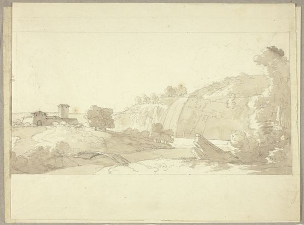 Editor: Here we have an artwork called "River Landscape," likely created sometime in the 19th century by an anonymous artist. It looks like it's rendered in charcoal and pencil on paper. It strikes me as very atmospheric; the soft, muted tones create a hazy, dreamlike quality. What compositional elements stand out to you? Curator: Immediately, I’m drawn to the distribution of tonal values. Observe the artist’s skillful deployment of chiaroscuro; notice how the light delicately defines form, giving weight to the riverbank on the right and then subtly fades into the background. The formal relations created through the contrast and diffusion are expertly handled, note for instance the relationship between the density of the architecture in the right and the distant one in the left, forming a structural asymmetry which is enhanced by the vertical orientation of the closest architecture which counterbalances the lateral dimension. Editor: That's interesting! So you see the use of light and shadow and architectural contrast not just as descriptive, but as actively shaping the overall composition and meaning. Do you see a sort of tension being created between these two architectural focal points? Curator: Precisely. Also observe the lines. The linear work, evident in the rendering of foliage and the small craft on the water, serves to enhance spatial depth, while also playing off of and framing with blocks of space. It invites closer inspection but note it’s subservient, it never dominates as the play of color defines the aesthetic object. What are your thoughts? Editor: I see what you mean, there is definitely a push and pull between line and tone! Ultimately the blending and variation of dark and light defines more than lines do. So you’re suggesting it’s the interplay of these elements, rather than a singular element like the subject matter itself, that creates the core experience of this artwork? Curator: Indeed. The work provides us with an exemplar demonstration of the artist’s skillful compositional arrangement. Editor: This really does emphasize the power of formal elements in creating an immersive viewing experience. Curator: Precisely.