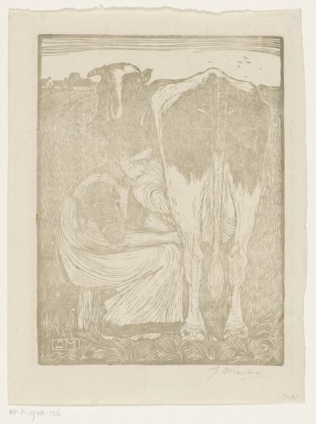 Editor: Here we have Henk Schilling’s "Verstrengelde, naakte man en vrouw" or "Entangled, Naked Man and Woman," created in 1919. It's striking how the muted tones and intertwined figures create such a strong sense of intimacy, but also almost…suffocation. What’s your take on it? Curator: Considering the historical context, right after the first World War, this work resonates with a larger cultural narrative. The war devastated a generation, and this image perhaps explores the desire for connection and comfort amidst widespread trauma and uncertainty. Does this embrace appear consensual to you, or are you perceiving tension? Editor: I definitely see the tension now that you point it out. It seems less romantic and more… desperate, maybe? Is the fact that they are nude significant? Curator: Absolutely. Nudity here can signify vulnerability, stripping away societal constructs to reveal the raw, human need for solace. Many artists explored the human form in that era, using it to represent primal emotions and anxieties. But I also wonder, what were the public displays of intimacy like in 1919? Could this pose be viewed as controversial? Editor: Probably pretty controversial. So, you are saying the cultural mood probably helped influence how this intimacy was displayed by Schilling? Curator: Exactly. It shows that intimate moments, too, are impacted by larger historical currents and are, indeed, quite political. It seems art is more involved than simply reflecting social contexts; it engages in a nuanced dialogue. Editor: I see it now. Thank you! It is as though we also need to recognize its entanglement with historical and political factors. Curator: Indeed, a good way to approach much of art history.