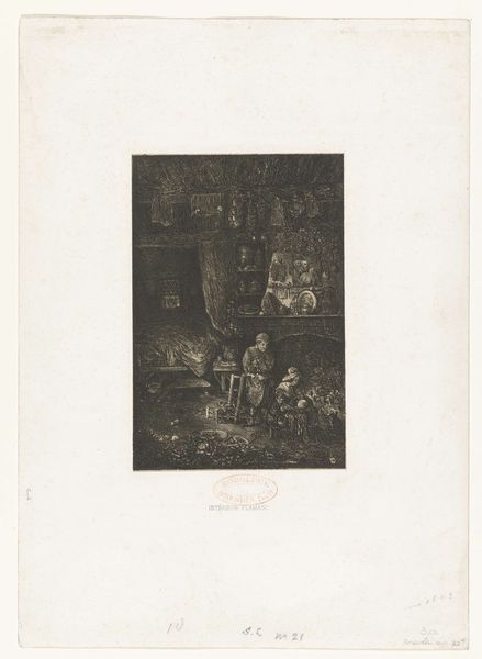 Editor: This is Rodolphe Bresdin's "Intérieur flamand," and it's held at the Harvard Art Museums. The density of detail is incredible! It feels like every inch is etched with something. What stands out to you about this work? Curator: I'm drawn to how the etching process itself informs our understanding. Consider the labor involved in creating such intricate details with the tools available. What does this level of detail suggest about Bresdin's relationship to the tradition of printmaking and its wider availability to a growing consumer class? Editor: So, it’s not just about what's depicted, but how it was made and who could access it? Curator: Precisely. The materiality of the print and its potential circulation are crucial to its meaning. The interior becomes a site of production, consumption, and social exchange. Editor: I hadn't thought about that. It makes me see the image, and the artist's choices, in a completely new light. Curator: It’s vital to see the art as a result of labor and a commodity.