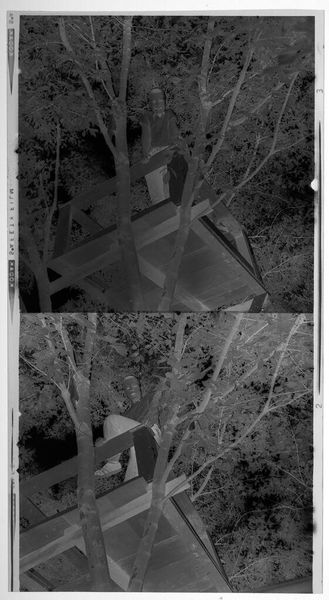 Editor: Here we have Jack Gould's photographic print, titled "Untitled (mother chimp with baby chimp in tree at zoo)." It feels…stark. What's your take on this piece? Curator: Oh, a chimp and her baby, in an artificial tree. It's sad, isn't it? Like a reverse Eden. I bet Gould felt it too. Makes you wonder, what is it to be truly free, or wild, or home? Editor: So it’s about captivity, not just of animals, but maybe…ourselves? Curator: Perhaps. Maybe Gould's saying we're all just acting out a role, same as those chimps, trapped in our own little zoos. What do you think? Editor: I hadn't thought of it that way. Definitely makes me see the image differently. Thanks!
