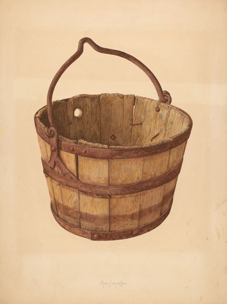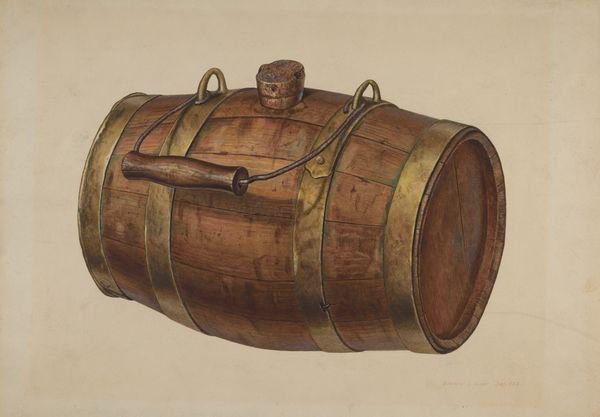 Curator: Looking at this work, I immediately think of stillness. The composition feels very self-contained and silent. Editor: And that feeling certainly aligns with the title of this rather humble still life, "Water Barrel or Runlet." We see it represented in watercolor, pencil, and charcoal drawing by Dana Bartlett around 1937. Curator: Water is such a fundamental element, a giver of life, and in folklore, it often stands for the unconscious. Representing a water barrel in this style, it almost feels like Bartlett is asking us to pause and consider the simplest vessels of sustenance and the precious resource they contain. Editor: He seems also very conscious of the way class is encoded. Everyday items can gain iconographic importance when represented artistically and hung in specific settings. One can see this runlet fitting in both the kitchens and halls of different kinds of estates. Curator: It’s curious how the texture and light are captured. Notice the concentric circles of the wooden end and then compare it to the shadowy bands around the sides. The materiality comes across beautifully, yet there’s also a subtle, dreamlike quality to the overall rendering. Editor: And I would guess Bartlett did not choose just any object. Runlets are often mentioned in documents that talk of workers in the early to mid 20th century. So while modest and unassuming, this illustration allows for thinking about both wealth and those who produced it in that moment of economic turmoil in the U.S. Curator: Seeing how a simple, functional object can reflect so much… it really opens up questions of what we choose to memorialize, doesn’t it? What meaning is embedded in everyday things? Editor: Absolutely. This work is a compelling reminder that art isn't just about grand narratives, it's about the stories held within the mundane.