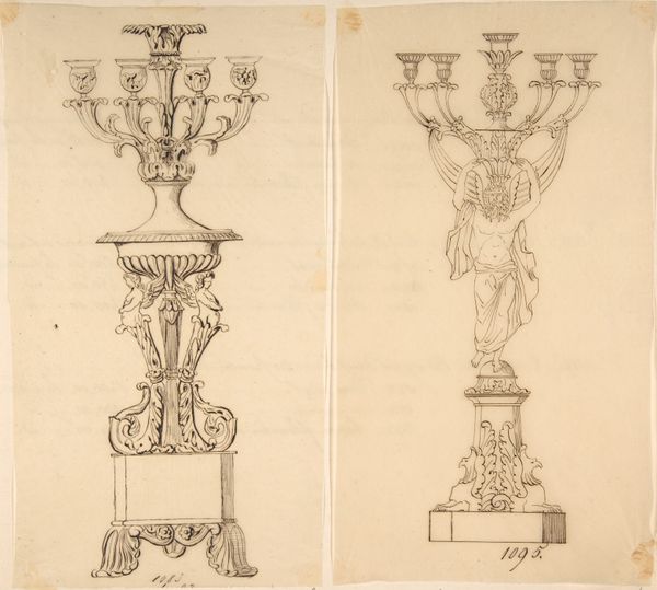 This undated drawing presents designs for two candelabras and a pedestal. The elaborate, curvilinear forms suggest a European origin, likely sometime in the 18th century. Note how the designs blend classical motifs – acanthus leaves, urn shapes – with an almost exuberant flair. Who were these extravagant items for? The answer lies, in part, in understanding the social function of decorative arts during this period. Objects like these weren't just functional; they were potent symbols of status and refinement. The aristocracy and wealthy merchant classes competed to display their taste and wealth through their possessions. These designs, therefore, reflect the culture of consumption that fueled artistic production. As historians, we turn to archival sources – inventories, trade records, design books – to better understand the social context that gave rise to this drawing. Understanding the institutions and structures that shape art, helps us understand the art itself.