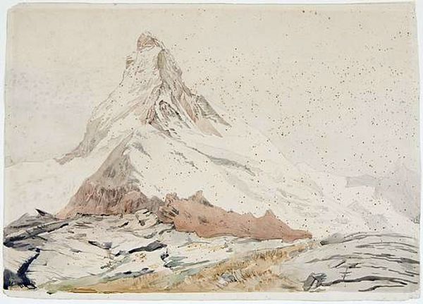 Curator: John Singer Sargent crafted this evocative scene of "The Matterhorn" in 1870, likely en plein-air as many watercolors are, wouldn’t you agree? Editor: A sublime vision, isn’t it? The sharp contrast between the snow-capped peak and the softer hues in the foreground really draws the eye upward, creating a dramatic, almost theatrical, effect. Curator: I find myself thinking about the specific papers available at the time, the possible recipes Sargent may have employed for creating that pale blue sky and the sheer logistical effort of hauling watercolor supplies up a mountain to capture the motif firsthand. The material reality deeply impacts how we perceive the scene. Editor: While the physical context is certainly relevant, consider how Sargent manipulated the watercolor medium to portray depth and texture. Look at how he uses layered washes to suggest the glacier's form. The strategic placement of those vibrant rhododendrons pulls the viewer into the space, establishing a visual foreground against the formidable mountain backdrop. Curator: The act of painting en plein air transformed the experience for nineteenth-century consumers, permitting greater commercial opportunities for the tourism industry as picturesque views became fashionable amongst an expanding wealthy leisure class. In the image itself, notice the marks denoting "zermatt". Such inscriptions indicate a desire to document particular experiences connected to specific locations. Editor: Indeed. But it's the formal elements – the dynamic line of the mountain against the diffused light – that generate the painting’s aura. He gives us a sense of the mountain’s enduring presence despite its depiction in an easily effaced medium like watercolour. This transience evokes temporality itself. Curator: By bringing the labor and the materials into view, and reflecting on consumer culture, we avoid venerating art objects based purely on inherent value. Editor: Still, even when recognizing those realities, you can’t deny the potent composition and inherent symbolic charge! I find Sargent creates a visually balanced encounter with a sublime landscape, a compelling experience of nature filtered through artistic expression. Curator: Perhaps, and as always, context and close readings both shed light in equal measure on art’s complex terrain. Editor: Yes, and hopefully our conversation gives visitors a fresh viewpoint for interpreting and experiencing its wonders!