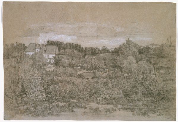 Curator: Cecil Lawson's "The Hop-Gardens of England" presents a vast landscape in oil on canvas. The Tate holds this impressive artwork, though we don't have an exact creation date. Editor: It feels so expansive, almost melancholic. The muted greens and browns give it a subdued, rural atmosphere. You can almost smell the earth. Curator: Lawson was quite interested in depicting the lives of rural laborers and the changing English landscape. Hop farming was an important industry, shaping both the economy and social fabric of certain regions. This painting might reflect both the beauty and the hardships associated with such labor. Editor: I wonder about the gendered aspects of this work. Who did this kind of labor? Were women involved? How might their contributions be rendered visible within a contemporary reading? Curator: Those are important questions, and Lawson's perspective, viewed through a modern lens, certainly has limitations. Still, the painting offers a window into a specific moment in British agricultural history and the aesthetic values of its time. Editor: It does make you think about our relationship with the land and the people who work it, even now. Curator: Indeed, a poignant and relevant consideration even today.