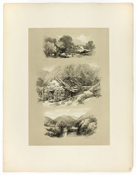 Curator: Immediately, I see such lovely contrasts, stark yet romantic, you know? It's like two little daydreams sitting side by side. Editor: Yes! We're looking at “Beaufort and Serves, from Picturesque Selections,” a lithograph on paper created around 1860 by James Duffield Harding. What strikes me is how these serene landscapes, seemingly divorced from overt political narratives, were actively consumed within a socio-political context of expanding tourism and notions of national identity. Curator: Expanding tourism...right! Suddenly these aren't just picturesque villages; they're postcards before postcards! Visual bait designed to make you ache for a trip. The artist's hand…it's not just sketching a scene, it's selling a feeling. Editor: Precisely. And consider the rise of illustrated publications during this era. Prints like these weren't solely artistic expressions but crucial disseminators of visual culture. The print medium allowed these visions to be widely accessible. Harding plays with light and shadow, capturing the architectural textures and mountain backdrops. Curator: Definitely playing with something, possibly my desire to just vanish into one of these prints. Look how detailed those little rooftops are, and the implied shadows...makes you want to peek into those windows, doesn't it? It almost romanticizes daily life in some faraway corner of the world. Editor: Well, yes, the “picturesque” aesthetic often selectively frames reality, idealizing certain aspects while downplaying the grittier sides of life. And the “picturesque” as a trend became quite the business. Curating the world into an aesthetic experience to be packaged and sold, effectively. Curator: So you're saying, while I'm swooning over quaint rooftops, I should be considering the commercial intent lurking beneath? The art historian never sleeps! But point taken, I guess this isn't just a harmless doodle after all. It’s got a message; come, spend money, discover “authentic” Europe. Editor: It's a balancing act, isn't it? Recognizing the role these images played within their time while still allowing ourselves to be captivated by the art. Curator: Alright, balance achieved. Now if you’ll excuse me, I think I’ll go book that European getaway. Inspiration struck. Editor: I suppose it proves the print is still working its magic even after all these years.