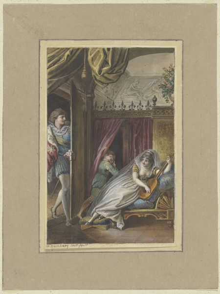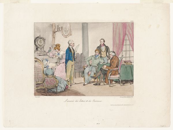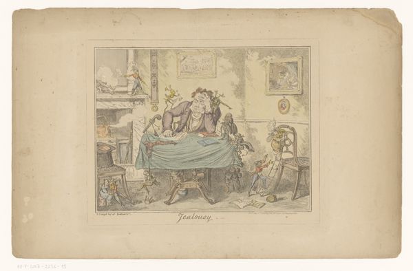 Curator: So, here we have Thomas Rowlandson’s “Four Men Looking at a Painting of Venus,” created around 1799. It’s a print, rendered with etching and watercolor, and it currently resides at the Rijksmuseum. Quite the suggestive scene, isn't it? Editor: Goodness, it's like stepping into a smoky back room! There's such palpable leering in the air! The watercolor softens what could have been quite a harsh satire, creating a strangely inviting—almost complicit—atmosphere. What do you make of their expressions? Curator: Rowlandson was a master of caricature, and here, we see that skill at play. The men, with their exaggerated features, embody a certain societal voyeurism, specifically the male gaze upon the female form—how power dynamics and expectations often dictated viewership, especially regarding classical nudes in this period. Editor: Right! And the painting within the print, Venus herself, seems almost indifferent to the crude ogling. Is it confidence? Or maybe exhaustion, being an objectified icon through the centuries? It's a funny paradox; she’s both central and completely passive. I find myself strangely sympathetic toward her situation... even in cartoon form. Curator: That tension between the men's active, consuming gaze and Venus's passive form is crucial. Consider how history painting during the Romantic period intertwined ideals of beauty with themes of morality, often placing women in positions of virtue or temptation, viewed, judged. Rowlandson uses satire as a critique. The choice to put these men in such a predatory posture reflects the societal imbalance. Editor: Makes you wonder what Rowlandson truly thought, doesn't it? Was he mocking the men, or merely pandering to a similarly inclined audience? There's always this ambiguity, like a wink hidden in the watercolor washes. And there is some levity to it; look at the placement of those additional pictures hung on the back wall! I wonder if he added them as a counterpoint, to lighten the mood even more? Curator: Absolutely, I’d say Rowlandson shrewdly critiques and mirrors the norms. I agree, a difficult tightrope to walk but so incisive. Considering the piece’s presence in the Rijksmuseum today, it gives us opportunity to analyze societal and aesthetic values concerning gender, looking, and representation, both in Rowlandson’s time, and our own. Editor: Definitely something to ponder long after we've left this room. It reminds us how easily art—even something seemingly frivolous—can become a mirror reflecting our own prejudices and assumptions. Makes you itch to go create something provocative, doesn’t it?
