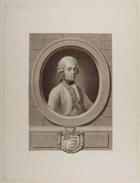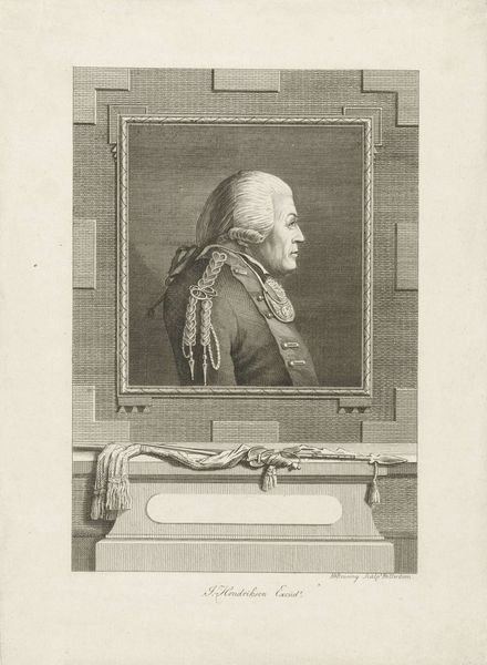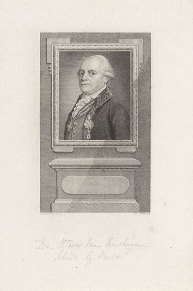 This is a monochrome print titled "Portret van Renaud-Philippe de Custine" made by Theodorus de Roode in the late 18th century. The portrait is framed within an oval, which is then set against a textured, rectangular backdrop. De Roode plays with geometric forms to create a composition that feels both formal and somewhat theatrical. Below the portrait, a rectangular block bearing the name "Custine" is supported by stylized architectural elements, resembling classical pillars. This elevates the subject, suggesting nobility and stature. The use of hatching and cross-hatching creates tonal variations, adding depth and volume to the figure and the surrounding architectural motifs. The clean lines and precise execution speak to the values of the Enlightenment, emphasizing order and clarity. However, the very act of framing the figure, of placing him within these constructed forms, raises questions about representation and the role of portraiture. The image doesn’t merely reflect reality; it actively constructs it. It offers us a glimpse into the artistic and philosophical concerns of the time.