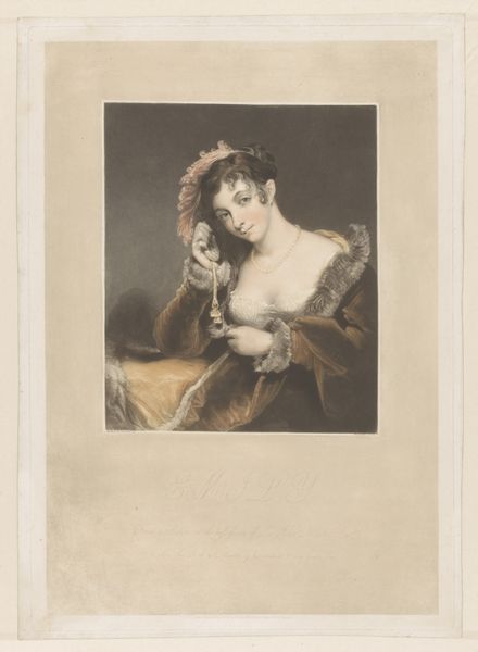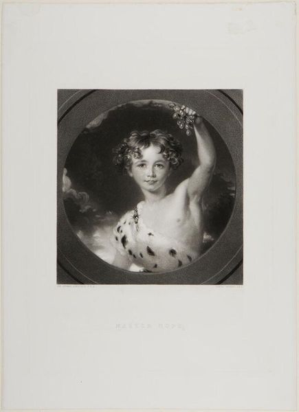 Editor: This is "Boy with a Bunch of Grapes," a print by Samuel Cousins, made around 1836 or 1837. It's such a sweet portrait, but there's also something slightly unsettling about the boy's expression and the swirling clouds behind him. What strikes you most about this piece? Curator: The grapes held aloft are heavy with meaning. Consider the grapes’ traditional association with Bacchus, the god of wine, ecstasy, and theatre, all potent symbols. Does the boy present them, offer them to us, or perhaps hold them as a personal talisman? His ambiguous gesture complicates the seemingly simple imagery, echoing sentiments and classical ideas through visual symbols. Editor: So you're saying the grapes are more than just...fruit? How would someone in the 19th century have understood this symbolism? Curator: Likely they'd have recognized the layering of classical references with contemporary aesthetics, especially within the rising Romanticism. The boy's youthful beauty juxtaposed with grapes creates an idealized, almost mythical portrait that suggests an innocence intertwined with hedonism. Consider also the circle framing him, which could evoke a protective halo, isolating him against what feels like encroaching storm clouds, implying themes of virtue tested or time passing. What memories do the grapes bring to your mind? Editor: I hadn't even noticed the circle around him or thought of the grapes in that context. Thinking about it now, the clouds feel like they're part of the message too... perhaps even more threatening given the classical symbol of Bacchus? It all suddenly feels very dramatic and slightly worrying. Curator: Precisely! The image then is operating on multiple levels of experience, hinting at emotional and cultural depths beneath a simple portrait. Editor: Thanks for highlighting the layered symbolism – it's completely changed my reading of the piece. Curator: It serves as a beautiful reminder that even seemingly straightforward images carry layers of history and memory ready to be uncovered.