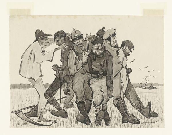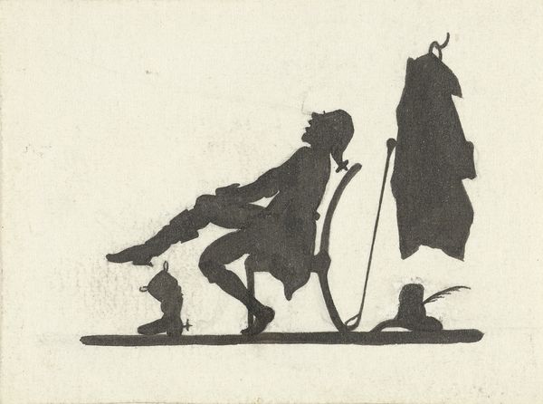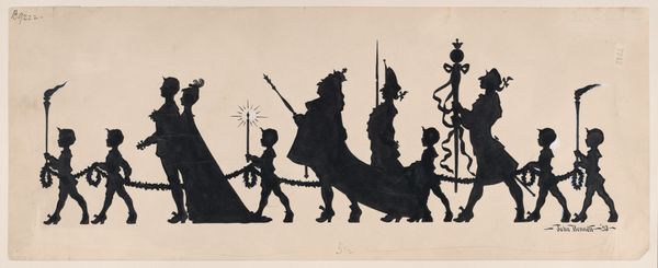 Editor: This drawing, titled "Ontwerp voor illustratie voor In Holland staat een huis: silhouet van de familie met de hond en de kat," is attributed to Nelly Bodenheim and was likely created between 1884 and 1917. The figures are rendered in ink on paper in a silhouette style, creating a stark contrast. It feels… nostalgic, almost like looking into a lost world. What do you see in this piece? Curator: This silhouette evokes for me the ways in which ideas of "family" have been both idealized and weaponized throughout history. Think about the traditional family structure depicted – who is included, who is excluded? Whose stories are prioritized and whose are erased within this representation of domesticity? Does the artwork perpetuate a specific class or gender expectation? Editor: So, you’re suggesting that this seemingly simple depiction carries loaded implications? Curator: Absolutely. Consider the position of women and children in the domestic sphere during the time it was created. Silhouette art, especially family portraits, often functioned as symbols of status, but also of control. The very act of rendering figures as empty shapes suggests an absence of individual agency, which invites critical readings based on gender roles and power dynamics. Is there any visual detail that supports or challenges the status quo? Editor: It is difficult to distinguish between different social standings, since there aren't many unique identifiers in the silhouette style used by the artist. This style arguably does little to disturb historical narratives on family. Curator: Exactly. This piece encourages us to examine those historical narratives and the visual language used to reinforce them. How can this inform the viewers of today? Editor: I see your point. It’s a reminder that even seemingly innocent depictions of family life can reflect complex social and political realities. Curator: And perhaps help us to think more critically about the representation of family in contemporary art and culture.