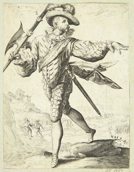 This etching, titled Obersten, meaning "Supreme" in German, was made by an anonymous artist. The print depicts a flamboyant military leader, likely intended as a high-ranking officer in the 17th century. Notice the puffed sleeves, wide ruff, and feathered hat, all indicators of status. The figure carries both a sword and what appears to be a ceremonial halberd, emphasizing his military authority. Prints like this circulated widely in Northern Europe, acting as both documentation and potential propaganda. They speak to a culture deeply invested in military power and social hierarchy. The etching's creation and distribution reflect the growing print market and its influence on shaping public perception of leaders. Analyzing such images requires delving into military manuals, costume histories, and period literature to grasp the nuances of status symbols. Only through this research can we understand how art, even seemingly simple prints, played a role in reinforcing social structures.