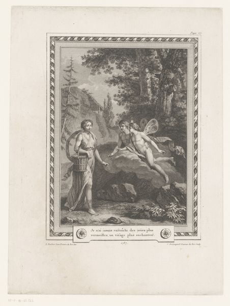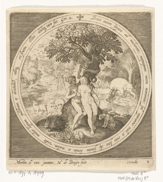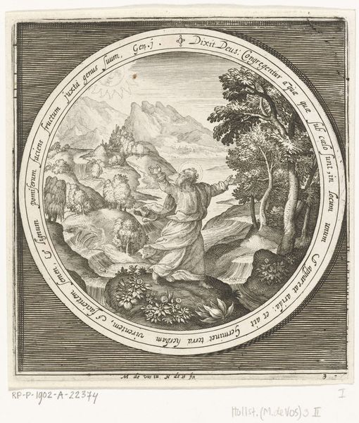 Nicolaes de Bruyn created this print, "Third day of creation: God creates land and seed-bearing plants and trees with fruits that bear seeds," sometime between the late 16th and mid 17th century in the Netherlands. The image depicts a moment from the Book of Genesis, visualizing the divine act of creation. Prints like these circulated widely in the Netherlands. In their time, the social function of such images was primarily didactic: to illustrate Biblical stories and reinforce religious teachings for a largely literate public. Here, the image's meaning is constructed through recognizable visual codes - God, framed by a halo, gestures towards the earth, commanding it to bring forth vegetation. The presence of Latin text indicates that it was meant for an educated audience, a product of the prevailing cultural and religious norms of the time. To understand this work better, we could look at the history of religious printmaking in the Netherlands, the role of the church in society, and the circulation of biblical imagery. The meaning of art is contingent on its historical and institutional context.