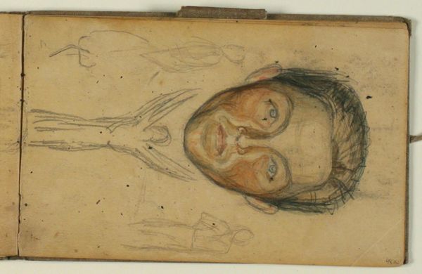 Curator: Let’s discuss Niels Larsen Stevns' "Ansigtsstudie og uidentificerede skitser," dating from 1900-1905, here at the SMK. My immediate response is drawn to the intimacy suggested by these pencil and colored pencil sketches. They seem very personal. Editor: It's striking how raw and process-oriented it is. I am curious, what kind of pencils do you think Stevns was using? I wonder about the social context that made such a private display of working drawings acceptable, where these types of sketches usually remained behind closed doors of studios or private homes, not for display like the finished artwork. Curator: The sketch’s very display within the museum framework transforms its function. It moves from a mere preparatory tool to an artwork studied and valued in its own right. We read into the figure, looking for a subject or narrative to create where there isn’t one. It seems the museum and Stevns himself shaped how we see this page in his sketchbook. Editor: Yes, the shift is key. It challenges our preconceived notions about artistic production. Are these mere studies, or does their display elevate them? Considering his methods, and these raw marks on paper – this shows the consumption of readily available and mass-produced graphite and colored pencils. This suggests that these accessible materials are essential to the democratization of art at the time. Curator: Absolutely. And the way this specific sketchbook was eventually donated by inheritors – what’s highlighted versus hidden? These details greatly inform how future generations engage with the artist's legacy. Editor: This sketch reflects a larger question of accessibility and the artist’s hand within emerging visual and material cultures. I’ve never thought about sketchbooks in quite that way. Curator: Precisely, its public accessibility opens the artist’s labor and tools to analysis, beyond pure aesthetic judgment. Editor: A perspective shift.