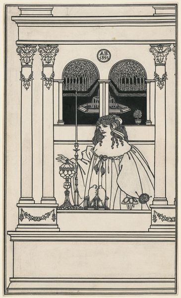 Editor: This is Aubrey Beardsley’s 1895 ink drawing, a frontispiece for "The Story of Venus and Tannhäuser". I find the stark black and white contrast incredibly striking. What draws your eye in this piece? Curator: Immediately, the pronounced linearity seizes attention. Observe how Beardsley meticulously employs line, not merely as contour but as a force constructing form and dictating visual rhythm. Do you perceive the spatial ambiguity he cultivates through this meticulous, almost obsessive, linework? Editor: I do. The perspective seems flattened, especially with the arches and the landscape behind Venus. The detailed foreground seems to exist on the same plane as the background. Curator: Precisely. The composition rejects traditional Renaissance perspective, favoring a calculated distortion. The columns and arches establish a rigid, almost architectural framework, juxtaposed with the fluid, organic curves of Venus and the surrounding ornamentation. Note the contrasting textures; the dense, intricate foliage visible through the arches against the smooth expanses of the figure's garments. This tension generates a potent visual dynamic. The use of negative space also plays a crucial role; it’s as deliberate and considered as the inked lines themselves. Editor: That’s a good point. It really emphasizes the figure in the foreground and those very ornamental details. It's so different from the naturalistic art being made at the same time. I'm struck by how deliberately Beardsley plays with established artistic conventions to achieve his aesthetic. Curator: Indeed. By challenging those conventions, Beardsley pushes us to contemplate the very nature of representation and the interplay between form and meaning.