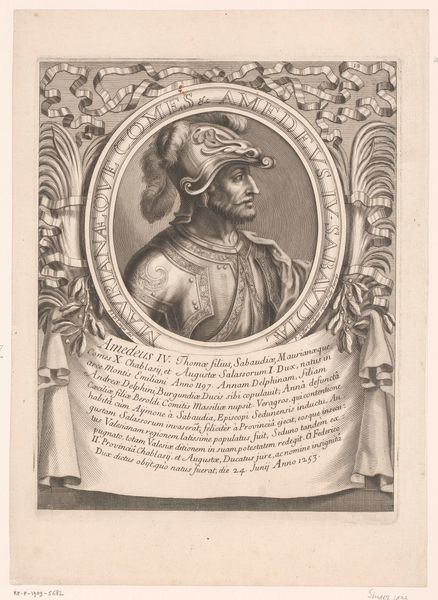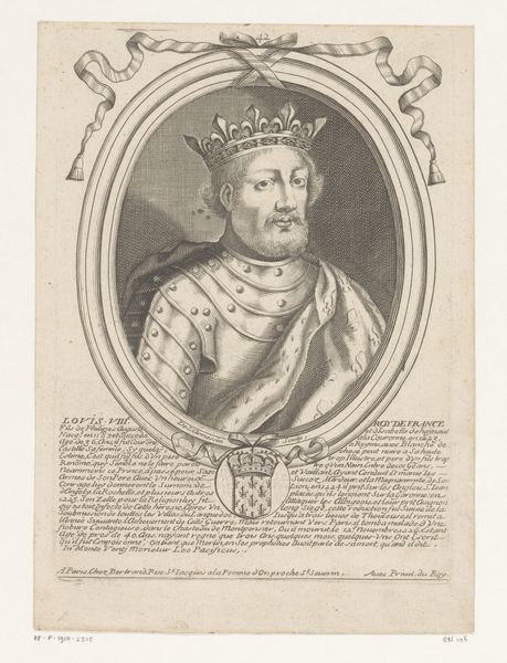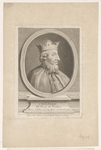 This print, portraying King Pharamond, was made by Jean Frosne in the 17th century. As an engraving, it began with a metal plate, likely copper, meticulously incised to hold ink. The lines you see are not drawn, but impressed – a testament to the engraver's skill and labor. Consider the social context: prints like this were essentially proto-mass media. They enabled the wide distribution of images and ideas, in this case solidifying the image of Pharamond. The texture and weight of the paper speak to the rise of a print culture, where images could be easily reproduced and disseminated. Prints like this also reflect the organization of labor: while Frosne’s name is attached, the production likely involved other hands, from the preparation of the plate to the printing itself. By understanding the material processes, we understand the image as both a work of art and a product of its time.