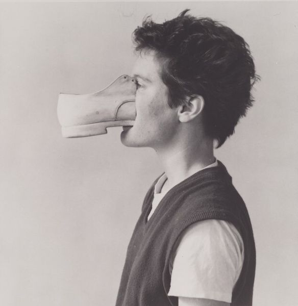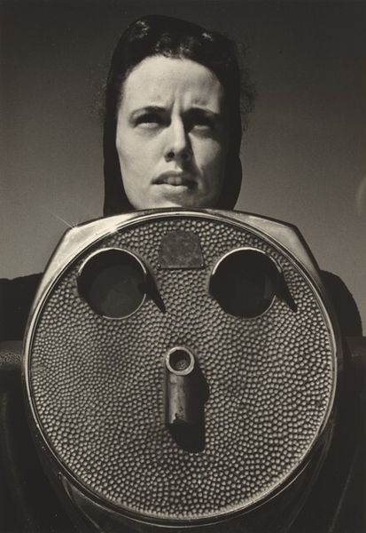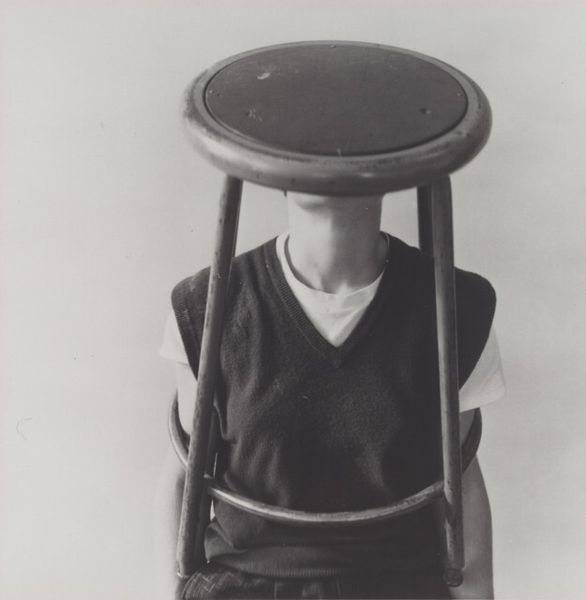 Editor: So, here we have Ann Hamilton’s gelatin-silver print, “body object series #9, stoveplate,” possibly from the mid-80s to early 90s. The starkness of the black and white and the way the plate obscures the face is a bit unsettling. How do you interpret this work, particularly its engagement with identity? Curator: I see it as a powerful statement on the construction of identity, particularly how societal roles and domesticity can both reveal and conceal aspects of ourselves. The stoveplate, an object deeply connected to the domestic sphere and historically associated with women's labor, acts as a mask, both hiding and highlighting the subject's gaze. Does this piece perhaps raise questions about gendered expectations within the domestic space for you? Editor: Absolutely, the stoveplate immediately made me think about domestic labor. The eye staring through the hole almost feels like a cry for recognition within that space. Curator: Exactly! And consider the title, "body object series." Hamilton seems to be intentionally blurring the lines between the human and the object, prompting us to consider how our bodies are perceived and used within capitalist systems. The act of obscuring the face can also be seen as a commentary on how individuality can be suppressed or distorted by societal pressures and how the domestic space itself can be a site of both comfort and oppression. What do you make of the gelatin-silver print choice for its medium? Editor: I guess the use of photography makes the scene look quite candid but old fashioned at the same time, which in return, may point at something perennial. It definitely adds to that feeling of unease. Curator: It amplifies that uncanny feeling, that tension between recognition and alienation. By using appropriation, the artist pushes us to analyze assumptions around identity and the gaze and engage with difficult intersectional realities. It's great that you picked up on this effect. Editor: That's fascinating. I never considered the broader implications of the domestic object. This really gave me a lot to consider, particularly regarding the historical weight behind everyday objects and their relationship to identity. Curator: Me too. By looking at everyday objects as mirrors reflecting identity, we become active agents in challenging existing norms.