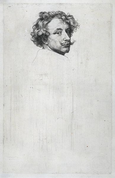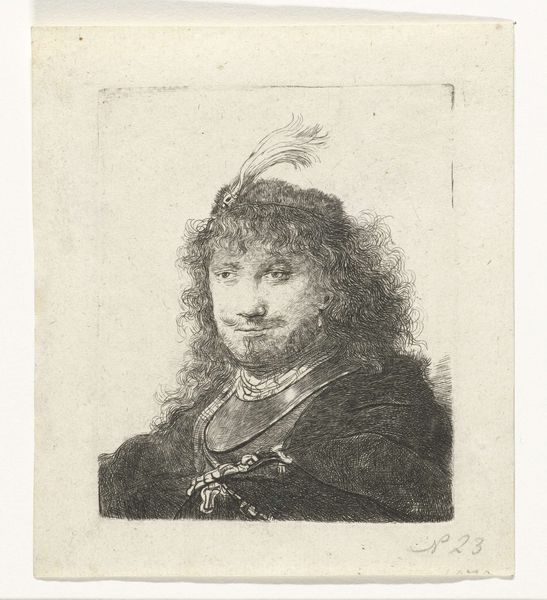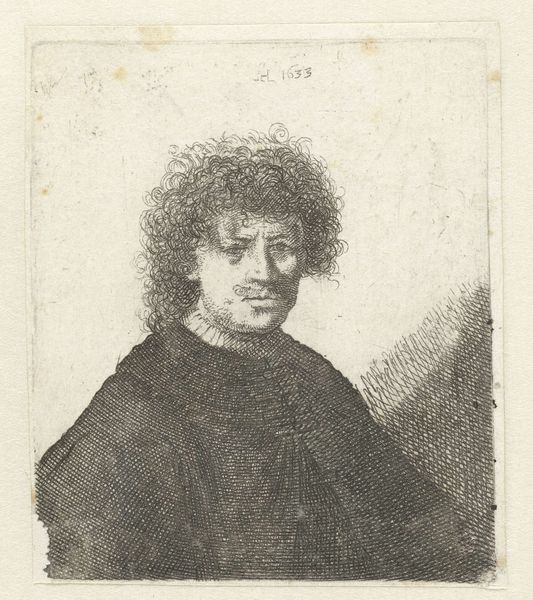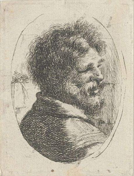 This is Johann Andreas Benjamin Nothnagel's etching titled "Boerenman," created in 1771. During the 18th century, representing individuals from lower social classes was often intertwined with political and social commentary. Nothnagel, working within this context, presents us with a man whose gaze holds a story of resilience. It’s interesting to consider how class distinctions were portrayed through art, and what role these images played in shaping societal perceptions. The man's weary eyes and unkempt appearance speak to a life of labor, but also perhaps to a certain dignity. There is something in the tilt of his head, his direct gaze that suggests we see him as an individual, rather than a type. Ultimately, Nothnagel's etching is a nuanced exploration of identity, inviting us to reflect on the complex interplay between representation, social class, and individual experience during this period.
