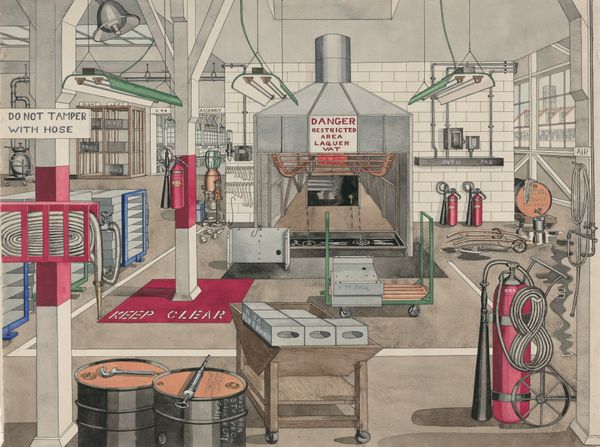 Editor: This tempera and drawing, titled "Basement of Urban House, 1910," was created around 1947 by Perkins Harnly. What strikes me most is its meticulous detail; it feels like stepping into a time capsule. But it also has a strange calmness despite all the clutter. What catches your eye when you look at it? Curator: Calmness, you say? I feel it too. Perhaps it's Harnly's way of freezing a chaotic space, pinning down domesticity for observation. This reminds me of childhood memories spent exploring attics, dusty with the echoes of previous lives. Look closely – there’s a story hinted at in every object, isn't there? What does this collection tell *you* about the people who might have lived here? Editor: I get a sense of resourcefulness, maybe even nostalgia? Everything seems kept for a reason. I imagine the family might have struggled financially but valued history. It feels…lived-in. Curator: Exactly! This isn't just a basement; it's a reservoir of memory, isn’t it? And it begs the question: how much of *our* own identity is bound up in the objects we choose to keep, or the spaces we neglect, thinking nobody sees them? Harnly presents a basement – so easily overlooked – and elevates it. Makes you wonder what we miss when we don't look closely enough at the mundane, right? Editor: It certainly does. I went from just seeing "clutter" to really considering what each piece meant, especially from a historical context. Curator: And maybe, just maybe, next time you’re down in your basement or rummaging through a thrift store, you'll feel a shiver of connection to folks just like them – reaching out from the past, through the magic of things.