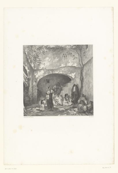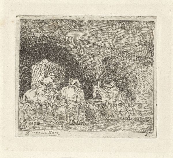 Editor: This is Jean Jacques de Boissieu’s "Stable Interior with a Man Surrounded by Five Children", an engraving from 1780. The print offers a snapshot of what seems to be everyday life, blending figures with the mundane: livestock and domestic duties all in a shared interior. It’s quite detailed, given the medium. How can we approach understanding a piece like this? Curator: It’s fascinating how De Boissieu collapses distinctions. We see 'high art' strategies, like the careful arrangement of figures, applied to the quotidian reality of labor, to farm life. Notice how the texture achieved through engraving – think about the labor involved – imitates the grit and roughness of the stable itself. What does the very material of the artwork tell us about the subject? Editor: That's an interesting perspective! I was focused on the human element and narrative aspect, but you're right, the material speaks to a whole different meaning about work itself. Curator: Exactly! It’s easy to overlook, but consider the socioeconomic context. This was made on the eve of revolution. Are these images of labor just that? Or are they subtly examining the social structures and the roles within them? Look at the tools that are around in the engraving. What are these ordinary people actually doing? Editor: The man appears to be an overseer with all the children in one area, while there is someone possibly milking a cow. It speaks to social class. Curator: Precisely. It is these interactions between subject, material, and means of production, that unlock how the print can engage with societal questions about labor and value, even if subtly. It's the blending of genre, landscape, and the details of technique. Editor: This is a great reminder that appreciating art involves really thinking about the labor behind creating the image, and how that informs the context and content. Curator: Yes, analyzing an artwork involves recognizing the importance of the making in relation to its representation. Thank you.