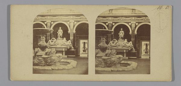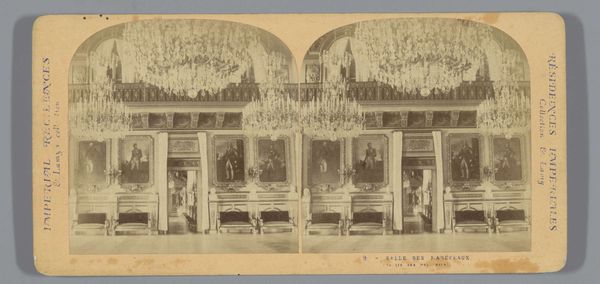 Curator: Welcome. We're looking at an albumen print from between 1855 and 1875, titled "Slaapkamer van keizerin Joséphine in het kasteel van Fontainebleau"—Empress Joséphine's Bedroom in the Château de Fontainebleau. What's your immediate impression? Editor: Claustrophobic luxury. The image fairly vibrates with pattern—fabric, wallpaper, chandelier. The symmetry is almost oppressive, but in an aesthetically compelling way. It feels like a stage set, rather than a bedroom. Curator: The symmetry certainly lends a theatrical air. Beyond the compositional mirroring, consider the chandelier. The placement feels deliberately balanced, anchoring the opulence in something resembling order. Editor: Chandelier as sun king? I wonder if it is simply reflecting the power or it is hinting at some more intimate stories of Joséphine. One has to ask about Joséphine's complicated legacy; her story and reputation long outlived her, so that this image became symbolic. Curator: Symbols certainly abound. Think about the bed itself. Framed, elevated, centered—it is presented almost as a sacred object. The very architecture seems designed to emphasize it. What does the architecture suggest in this context? Editor: Absolutely. It's the ultimate display of power and fertility; the origin point for legacy and legitimacy. But, viewed in stereo, which this albumen print was likely designed for, that singular, symbolic meaning fractures into three dimensions, as if destabilizing this grand vision. The materiality contradicts the represented symbolism! Curator: A destabilization that mirrors Joséphine's own rather tumultuous life? I find myself drawn to the way the light interacts with all the intricate detailing. Despite being a black and white print, the varying textures allow light to almost sculpt the space. Editor: Indeed. I can almost feel the chill of those marble floors under the thick pile of the carpets. I came away feeling rather somber after studying this photograph. I kept returning to a vision of all the symbolic gestures the space encompassed. Curator: It leaves a haunting impression, to be sure. Thank you for providing fresh perspective. Editor: The pleasure was mine. It's quite thought-provoking to analyze the artwork under such constraints.