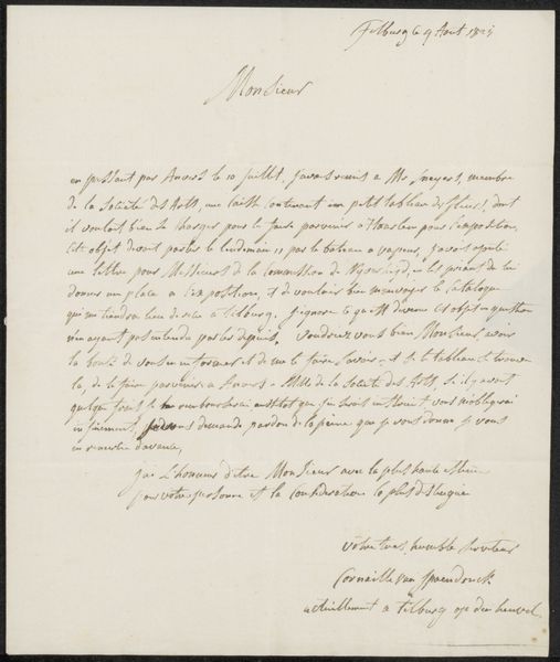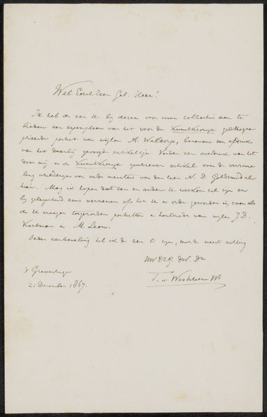 This letter was written by Jan Willem Pieneman to Adriaan van der Willigen, though we do not know exactly when. The sweeping calligraphic gestures, rendered in dark ink, immediately recall ancient methods of communicating. Letter-writing itself is a ritual, isn’t it? A way to bridge distances, physical and emotional. Consider the folded paper, once a blank slate, now filled with intent and emotion, not unlike the opened scroll in ancient Greek art. The careful construction of sentences parallels the composition of an artwork, each word chosen to convey a particular meaning or feeling. The signature at the bottom, Pieneman’s mark, is reminiscent of a personal emblem. It asserts the artist’s identity. It's a powerful act of self-assertion that transcends time. The written word, like an image, carries within it a silent power, a presence that lingers long after the hand has moved on.