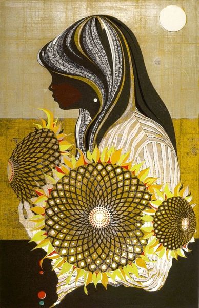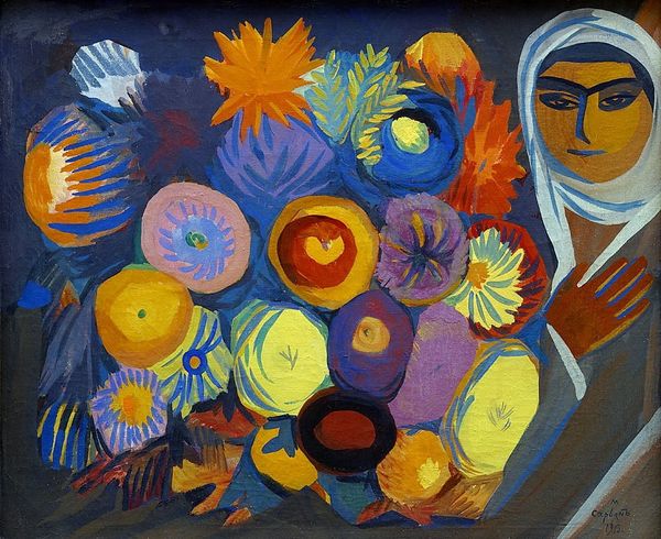 Curator: Radi Nedelchev painted this “Woman’s Head” in 1968, using oil paints. Editor: My goodness, she's rather otherworldly, isn't she? Those eyes... it's like looking into a folk tale. Curator: There's certainly a stylized innocence, a nod toward naïve art perhaps? What draws your eye specifically? Editor: The composition—that elongated headdress framed by those circular shapes… It feels deliberately symbolic. The repeated circles feel to me like representing continuity, wholeness. She is completely present in her attire, and yet absent somehow. What's the structure conveying to you? Curator: The dark background certainly intensifies her gaze, making it impossible to look away. But what do you think of the flattened perspective and almost deliberate lack of detail in areas, contrasting with the more defined ornamentation? Is it a technique designed to pull forward folk art, to elevate it to a fine art setting? Editor: Precisely. Nedelchev is using flattening not just as technique, but as a kind of semiotic code. It pushes us to acknowledge the surface, to contemplate the symbols of identity rather than searching for individual depth in a lifelike rendering. It suggests tradition viewed through memory. The past seems both real and remote. Curator: So in a sense, she exists as more of a representation of a collective identity than as a single individual. The artist manages to get something ancient into oil on canvas. Editor: Precisely. The very deliberate compositional construction draws you in slowly. The symbolism of her garments, which I first interpreted as rather superficial adornments, now feels to have roots far beneath the soil and up into the cosmos! Curator: Well said! She continues to shift and alter depending on my mood, an attribute only seen within skillful artwork. Editor: Agreed. This isn’t just a picture; it is a vessel.