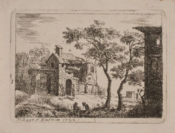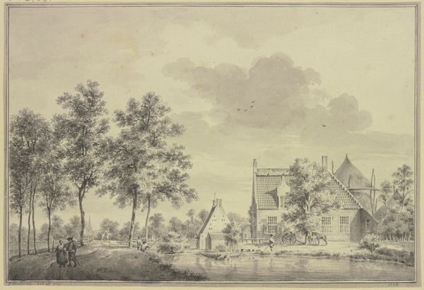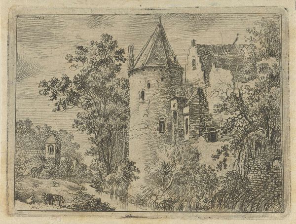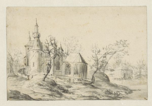 Curator: Looking at this drawing, it’s Abraham Rademaker’s "City gate with portcullis," currently housed in the Städel Museum. It's rendered in ink and pencil. A quiet, evocative scene, don't you think? Editor: Evocative, certainly, but the sepia tones give it a rather melancholy feel. It’s less about celebration and more about memory, wouldn't you agree? I am struck by the strong compositional arrangement; the gatehouse in the center acts almost as a fulcrum, dividing the scene in a way, guiding the eye back toward the larger structure, deeper into the drawing. Curator: Yes, the monochromatic palette undeniably casts a nostalgic light. These kinds of architectural renderings by Rademaker are like ghost prints; you can see many abandoned or repurposed architectural structures. It reminds us that the only permanent condition is that of impermanence. That the very ground of what appears to be fixed, firm, permanent buildings and structures, always shifts, breaks, is remade. What does that say about our attempts to erect seemingly immovable structures, both mental and architectural? Editor: Very poetic. I tend to think of those themes playing out in terms of the relationship between line and shadow here, too. There's a clear interest in architectural detail in the lines used to define the gate and larger building. See how the architecture and its openings repeat motifs found throughout the surrounding nature--an analogy between nature and architectural forms, like mimicry? Curator: I see it similarly; the lines mimic the very vegetation that seems to be consuming the architecture. Nature and architecture engaged in the drama of time. The gateway as a threshold to somewhere between reality and dreams. What’s interesting is how nature becomes symbolic. Is Rademaker presenting a landscape in decline, a loss of the old, or perhaps a hopeful, if melancholy view of nature reclaiming a human artifact? It all reads to me like the passing of epochs, of once-mighty fortresses dissolving. Editor: That reminds me of semiotics: the drawing might not explicitly say 'decline,' but the crumbling facades act as signifiers that nudge our perception in that direction. We unconsciously register 'disrepair' as a symbol with layered associations to ideas around loss or change. I find it intriguing how the artist makes us do that work of translation and meaning-making. Curator: And it also raises questions about how cultures encode symbols of status, power, and so forth through buildings. Those structures then become associated with particular memories for both individuals and cultures. It suggests that symbols, while powerful, can eventually become eroded or changed with shifting realities, whether social, political, or personal. Editor: I agree entirely; looking more closely at the line work itself I understand even better now that interplay of permanence and impermanence through a strictly formal lens. Thanks for untangling this rich, melancholic picture together! Curator: It's been a fascinating exchange. Now when I return to it I think I understand a new meaning to that symbiosis between humanity and our habitat as our built environment dissolves into the very soil from which it was raised.