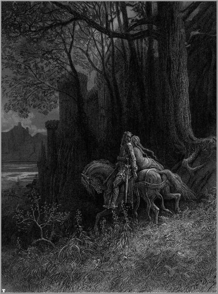 Curator: Here we have Gustave Dore's "Satan in Paradise," rendered in ink on paper. Look at the detail; it's extraordinary. Editor: It is stunning. The density of the foliage almost swallows the figure. There's a sense of immense scale at play here, dwarfing even what I presume is Satan himself. Curator: Dore was a master of visual drama, particularly known for his illustrations of literary classics. Think Milton’s *Paradise Lost*, Dante’s *Inferno*. This work likely relates to the same narrative, situating Satan in a romantically rendered, albeit imposing, landscape. It really catered to the Victorian era’s fascination with the sublime. Editor: Sublime indeed. The composition guides your eye; the contrast is exceptional. The way he uses line work to create a feeling of depth is masterful. Observe the shift from the darkness of the foreground to the light flooding the background, practically blinding! Curator: Absolutely. Dore’s technique perfectly reflects the era’s interest in grand narratives and moral anxieties. Remember, industrialization was rapidly reshaping society. Perhaps the brooding landscapes reflected the fear and alienation of a changing world. Editor: Perhaps. The figure is a little too sentimentalized to instill the intended dread, though. A more daring line, or a more daring subject matter, might challenge our reading. Yet, in its romantic pictorial conventions it still creates a space for self reflection within us. Curator: Ultimately, Dore's work played a critical role in shaping the visual understanding of literary classics for a broad public. He democratized imagery on a grand scale through these readily available prints. Editor: It does seem, at first glance, paradoxical that a visual work is so deeply invested in a purely symbolic world of heaven, hell, morality, and belief, where what's visually compelling might just be a sign. Curator: Indeed. A powerful reminder of how art becomes inextricably linked with social commentary. Editor: A compelling interplay between light, shadow, and the weight of history—quite the captivating artwork.