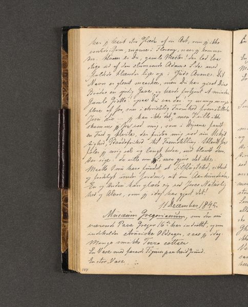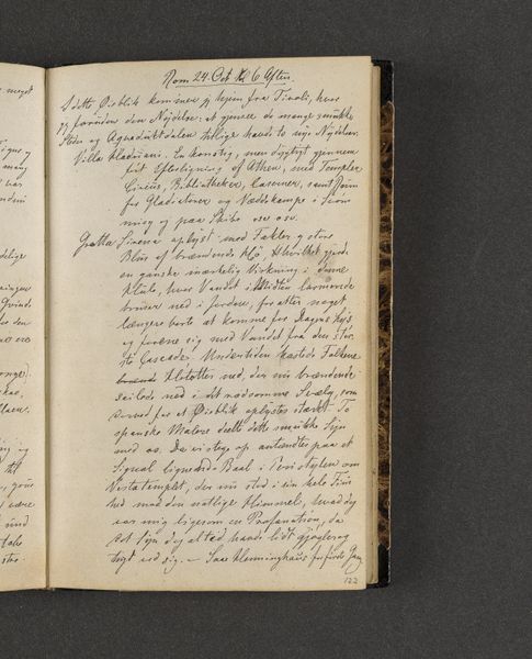 Curator: Well, here's an interesting one. This is a page from "Rejsedagbog", a travel journal from 1845 by Johan Thomas Lundbye, rendered in ink on paper. It's held at the SMK, the Statens Museum for Kunst. What's your immediate take? Editor: Intimate. The handwriting, though difficult to fully decipher, suggests a real person, a witness. The small scale also gives it the sense of something deeply personal and immediately recorded. Curator: Absolutely. Lundbye was a prominent figure in Danish Romanticism, and this little excerpt provides a peek into his observations during his travels in Italy. Look closely at how he describes St. Peter’s Basilica here; the emphasis he gives to materials: the mosaics, tapestries, various stones that cover the interiors. You get a real sense of a working artist noticing how a thing is put together, all the hands involved. Editor: I’m drawn to his notation about the Madonna in the crypt. Note his emotional description "deilig bijgentinok Madonna". A beautiful, gigantic Madonna. His immediate feeling that an encounter with such powerful religious imagery must have impacted a Romantic like him is evident. He really felt something viewing this. Curator: Indeed. His romantic, even subjective, engagement with material culture. His writing implies some careful and detailed attention to material. The mention of colors and textures brings out the rich tapestry of sensory details he chose to emphasize. Editor: Beyond the artistic or even the historical significance, this journal page embodies a continuing human need to mark our journey, to bear witness, and in doing so, discover both the world and ourselves. Curator: I agree. A single page speaks volumes, reminding us that even small observations, recorded with ink and paper, become powerful cultural objects over time.