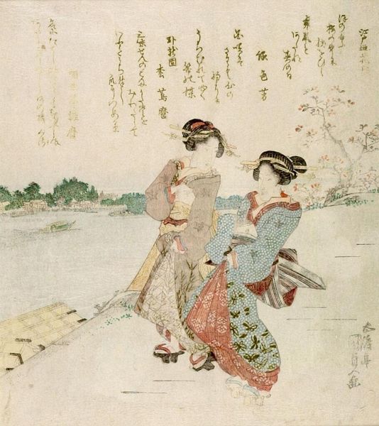Curator: This is Keisai Eisen's "See No Evil," part of a larger series exploring that familiar proverb. It's undated, but we know Eisen was active in the first half of the 19th century. Editor: Oh, it's charming! I love the way the figures are positioned, sort of weaving between the river and all that text floating above. It feels like a lovely, ordinary day. Curator: Right, and that sense of everyday life is deliberate. Eisen's prints often depicted courtesans and fashionable city dwellers. The series subtly comments on societal expectations of willful ignorance. Editor: Willful ignorance, huh? Well, maybe they just didn't want to see me attempt to paint! Though seriously, I get it. Sometimes, not knowing is… easier. Curator: The composition is particularly interesting when considering the context of censorship at the time. Editor: So, the image both conceals and reveals? Very clever. Makes you wonder what other hidden stories are just out of sight. Curator: Precisely. The print prompts us to think about the visual politics of 19th-century Japan. Editor: I'm leaving with a slightly different view on "ignorance" now. It's strangely powerful in its own way.