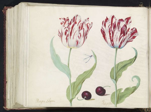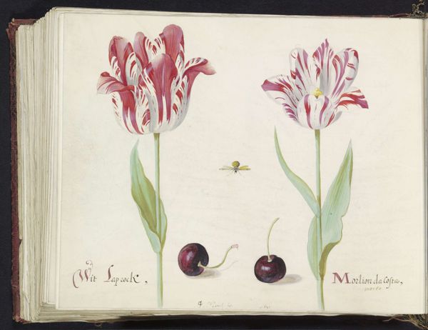 Curator: It’s a fairly light and airy piece, wouldn’t you say? Almost fragile. Editor: Yes, there’s a delicacy here. We’re looking at “Twee tulpen met twee kersen en vlieg,” or “Two Tulips with Two Cherries and a Fly” by Jacob Marrel, painted around 1637. The materials used appear to be watercolor and colored pencil. It’s currently held in the collection of the Rijksmuseum. Curator: My initial impression is one of observing early botanical documentation, almost scientific in its exactitude. The stark white background pushes the specimens forward. I find myself curious about Marrel's process here, the layering of colour, and whether these were painted from life, or from dried specimens. Editor: Absolutely. These images hold much significance when you consider tulip mania during the Dutch Golden Age. The tulip itself had become a symbol of status and wealth. Curator: Exactly! It provokes thoughts about consumption. The seemingly simple choice of rendering in watercolor—readily available but delicate—becomes fascinating when contextualized within this booming economy of status and the availability of resources. I'm curious about the labor involved in cultivating these flowers and producing the art itself. Editor: The fly adds a touch of vanitas, a subtle reminder of the fleeting nature of beauty and wealth, which feels so very potent, given the period's infatuation with such beautiful flora. Curator: Indeed. And that pairing of the tulip with cherries further complicates it. Two distinct markers of the seasons are represented together. Editor: Yes, the composition makes me wonder if the intent was solely about representing these individual items. The choices behind inclusion create new relationships with symbolism. Curator: So, from an analysis rooted in the work and materials to layers of iconographic implication… What have we found here, beyond botanical study? Editor: Perhaps that within art's presentation lies much greater meaning, both tangible and abstract, just beneath the surface.