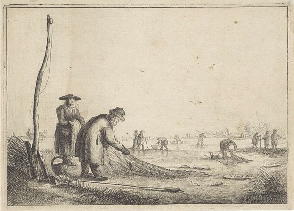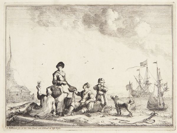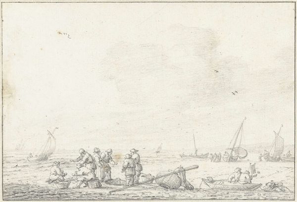 Jan van Goyen made this drawing of fishers and riders on the beach at Scheveningen in the Netherlands in the mid-17th century. It portrays a bustling coastal scene, capturing the daily life and social contrasts of the time. The drawing depicts a blend of social classes. Fisherfolk are sorting their catch, while mounted figures, possibly merchants or local dignitaries, observe the scene. Van Goyen's choice to include both groups hints at the economic and social hierarchy within Dutch society during its Golden Age. The church in the background underscores the importance of religion in daily life. The artwork provides us with insights into the maritime economy and social dynamics of the Dutch Golden Age. Further research into local Scheveningen history, the Dutch fishing industry, and class structures of the time could enrich our understanding. Art historians look at an artwork like this as a cultural artifact, reflecting the values and conditions of its time.