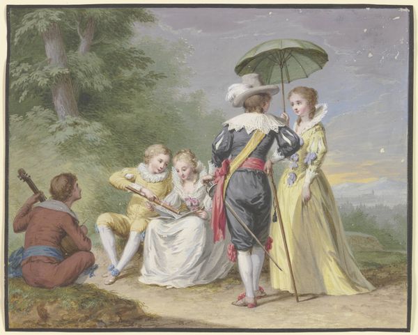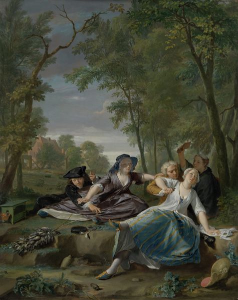 Editor: This is "Shepherds," an 18th-century canvas painting by an anonymous artist. It gives off such a gentle, romantic air with the soft colors and idyllic scene. What can you tell me about this work? Curator: This pastoral scene invites us to consider the societal structures and power dynamics at play. How does this staged vision of leisure serve to reinforce the existing class hierarchies of the 18th century? Notice the idealized, almost theatrical, depiction of rural life – far removed from the actual hardships faced by peasants and laborers at the time. Editor: That's a good point; it does seem overly romanticized. What about the presence of what looks like cherubs in the trees; how would that feed into the social and historical reading? Curator: Exactly! Those cherubic figures are not innocent decorations; they embody a set of social values tied to ideas of love, innocence, and natural order. Their inclusion signals a particular kind of morality, likely intended to legitimize the aristocratic lifestyle depicted here as inherently good and divinely sanctioned. Editor: So it is perhaps less about appreciating the art, and more about interpreting it in terms of political intention? Curator: I would not say that it is about political intention in any simplistic way, but the values evident here can point us to deeper insights about social norms and how art plays a role in shaping perceptions of gender roles, power, and what constitutes the 'good life.’ How do the garments influence your interpretation of that time? Editor: That helps me see beyond the surface prettiness. Thank you! Curator: My pleasure; it is important for art to connect the then with the now!