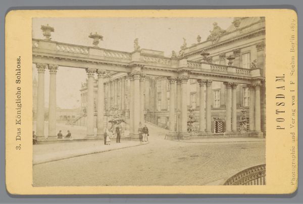 Curator: Looking at this albumen print, titled "Exterieur van het Gare du Nord te Parijs," attributed to the Compagnie Photographique Debitte & Hervé and dating from approximately 1865 to 1875, I'm struck by the palpable weight of history and ambition embodied in its neo-classical architecture. What's your initial reaction? Editor: The relentless repetition of columns immediately caught my eye, creating a visual rhythm. The texture is really soft, almost ethereal, given the monochrome palette and age of the print, isn't it? A grand composition overall. Curator: Indeed. This building isn't merely a train station. Think of train stations during this period; they symbolized a nexus of modern connection. The choice to evoke classical forms, like those very columns, tells us they consciously tied that new, fast paced world of rail travel with a rooted idea of Roman power. Editor: So, there's a visual dialectic happening? The modern infused with the ancient? Curator: Precisely! It taps into a wellspring of cultural memory, subconsciously positioning progress not as a rupture, but as a continuation of established, venerated legacies. They're not just ferrying passengers; they're carrying civilization forward. And it makes me consider who gets left on the platform by such forward momentum, and such displays of grandeur. Editor: The symmetry gives it a somewhat cold quality. What could seem exciting in reality might look oppressive here. Curator: I would say that oppression can be a product of context. When people arrived and disembarked, the light and sounds that surrounded them probably transformed any inherent sense of stoicism of the building into awe, or a deep resonance in feeling included as they passed under the gates. But as we reflect, detached from the actual event, the photograph invites consideration beyond sheer utility or immediate emotions experienced within this edifice. Editor: Yes, viewing it this way transforms my idea of a purely technical construction—like its materiality speaks, both of the weight it carries historically, and literally as it remains today. It has an imposing physical scale too. Curator: Looking closer allows us a vantage point, much like our vantage points, from a distance in time. This opens the symbols the space holds, to invite dialogue, instead of monologue, about progress itself. Editor: True. Ultimately, this print freezes a moment where old and new converged, and asks us how that convergence continues to shape our present.