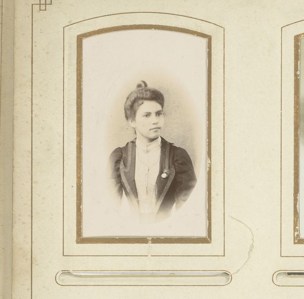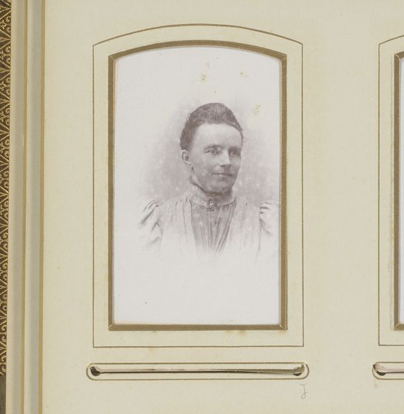 Editor: We are looking at a photograph entitled "Portret van een jonge vrouw," likely created between 1864 and 1884 by Leonard Stollenwerk. It is a striking portrait, and I am curious about your interpretation of its visual language. What do you see in this piece from a formalist perspective? Curator: Considering the visual elements, let us focus on the subtle gradations within the monochromatic palette. Notice how the soft focus employed contributes to a gentle diffusion of light, particularly evident around the subject's face. The frame within a frame – the photographic print mounted on card – draws attention not only to the central image but also to the constructed nature of portraiture itself. The subject's attire and hairstyle offer further avenues for analysis. How do you perceive their role in constructing meaning? Editor: I hadn't considered the interplay between the central portrait and its surrounding mount as a framing device, enhancing the performative nature of portraiture! It suggests a conscious layering of representation, and now I wonder what that says about the artist's intent and what was understood by the patrons of this era. Curator: Indeed. This work privileges the structural and material qualities of photography itself. We must ask, what impact does the materiality of the photographic print, as an object with a history, have on the image and how might its aging alter our perception? Editor: The focus on these intrinsic aspects offers a new, quite rich understanding. I hadn't considered how crucial these components are for shaping meaning in a seemingly straightforward portrait! Curator: By emphasizing the internal logic and the physical attributes of the artwork, the photograph is divorced from conventional interpretations that prioritize social history. It invites a purely visual assessment which deepens and extends our dialogue on art.
