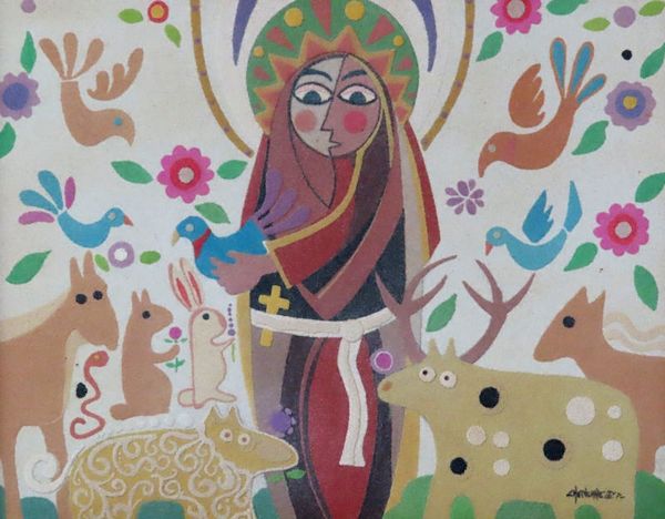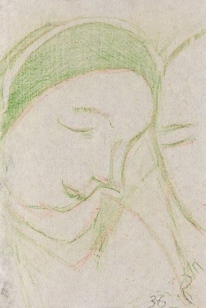 Curator: Mikuláš Galanda's "Woman", painted in 1938, captures a fascinating mood through simple forms and color. It's a watercolor piece. What are your initial impressions? Editor: A somber grace. The palette is muted, and yet those flashes of red on her chest and arms speak volumes about concealed passions. Curator: Absolutely. Red is almost always connected to primal energies, the root chakra if we’re exploring Kundalini, which resonates with the life-force he's captured, but restrained and inward-focused. Note, too, the ornamentation is minimal: some small symbols painted onto her exposed arm, possibly referencing archaic folk traditions, or ritualistic, even magical, practices. Editor: Yes, these folk symbols are telling. It hints at a world where female identity is not only defined by societal constraints but also by the enduring power of cultural symbols that are passed down and subtly re-interpreted from generation to generation. It reflects an internalized understanding of their position within that era, Slovakia on the verge of war. Curator: Precisely. The veil, both literally on her head and metaphorically, veiling the woman's true self, perhaps? There are interesting details to it: some leafy vines. They look like laurel to me: wisdom and eternity and associated with the God Apollo, maybe, or even echoes of Daphne fleeing Apollo’s advances by turning into a laurel tree. Editor: It evokes a struggle with external expectations clashing with inner life and how such burdens may shape women, even warping the true self for purposes of preservation or protest. This can be linked back to Galanda's own anxieties amid growing political tensions leading up to WWII. Curator: The power of symbols to hold trauma and endurance is clear. So often these visual markers provide a sense of cultural continuity, and a deeper exploration into hidden selves. Editor: These symbols may have helped Galanda process both inner emotional landscapes as well as provide a visual conduit to engage the rapidly changing world surrounding him. Curator: Thank you. It’s artworks such as these which give such a compelling vision to the era, by capturing in symbol a mood as powerful as this. Editor: And these layers offer multiple entry points that encourages dialogue between the social, historical and individual lived experience. Thank you.