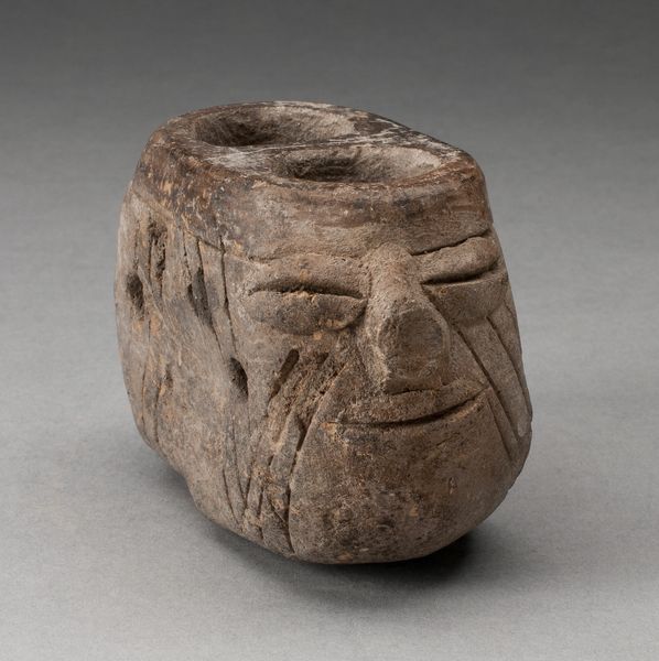 Curator: Here we have a striking piece, the "Double-Chambered Vessel," possibly dating back to between 100 and 700 CE from Teotihuacan. Editor: Oh, it has such a weighty presence, doesn't it? It feels like holding a miniature, ancient head in your hands – quite grounding somehow. I’m curious about that clay. Curator: The ceramic itself, the way it feels so undeniably earthen, really brings to mind its creation process. Think of the labor, the gathering of the clay, the shaping... it makes me consider the resources at hand and the hands that meticulously molded it. Editor: It’s captivating, isn't it? There's a distinct dreamlike quality to it – two cavities gazing heavenward while that enigmatic face remains firmly planted on Earth. The asymmetry gives it this feeling, you know? Like something caught between realities. Curator: Exactly! Consider that duality as part of its possible function – liquid and solid? Offering and… storage? The very act of pressing one's hands into the clay, giving it form and function. Who were they making it for, and how did they imagine its use? Editor: And the incised face - so serene. It feels like some kind of earth spirit, the way that single small hole indicates its gaze. I feel transported looking at the material presence. What kind of stories do you think that face could tell? Curator: A narrative of process, undeniably. But also the potential connection of Teotihuacan artists working in similar ways, reflecting possible trading relationships or at the very least shared values concerning resourcefulness and communal practice. Editor: Beautiful! This object seems to want to have lived a double life, between mundane vessel and ritual form. Curator: Perhaps we’ve both glimpsed one part of its rich, mysterious reality, then.