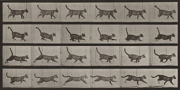 Curator: It's almost cinematic, isn’t it? We're looking at Eadweard Muybridge's "Plate Number 706. Dog; trotting; mastiff, Smith" from 1887, a gelatin silver print. The sequence captures a dog in motion, broken down into individual frames. It’s scientific, artistic, and a little bit magical all at once. Editor: Magical is right! My first thought was how segmented the movement seems; almost robotic but charmingly so. Each pose, so isolated, almost reminds you of very, very early animation. It's captivating and somewhat melancholic—isolating a moment over and over. Curator: Exactly. Muybridge was obsessed with capturing movement, aiming to scientifically analyze it. He used a series of cameras triggered sequentially to freeze moments in time, helping to understand locomotion like never before. This piece particularly underscores the process; it is clearly broken into a photographic assembly line. It reminds you that these studies changed our ways to analyze movement within manufacturing as well. Editor: That's fascinating because it really changes my reading of the "animal" in the study. We're not really considering a specific being as such but movement; a machine making movement possible. What do you feel we lose though when the photographic process makes art seem so readily reproducible in contrast to painting or sculpting? Curator: I think it democratizes the ability to question reality. Seeing these separate frames forces us to reconsider what we think we know about how a dog moves. We take it for granted, but Muybridge shows us the specific mechanics that go into such a simple action. Its beauty and charm rest precisely there! Editor: And the grid in the background—that almost utilitarian addition drives this forward by offering it to our mind as an exercise rather than, say, a poetic reflection of the dog in transit. One begins to see the role technology and industrial processes took when thinking about representing bodies in the late 19th century! Curator: I couldn't agree more. He really pushes the possibilities that photography and labor can achieve. It reveals that our understanding of bodies isn't naturally so, but one that rests on a complex interaction between different frames. Editor: Well, looking at this image I feel that the conversation that started with scientific aspiration then becomes an intimate dialogue about what art and technology mean. Curator: Beautifully said, bringing us to new frameworks and a lovely place to pause for now.