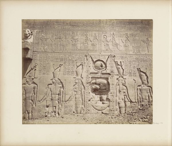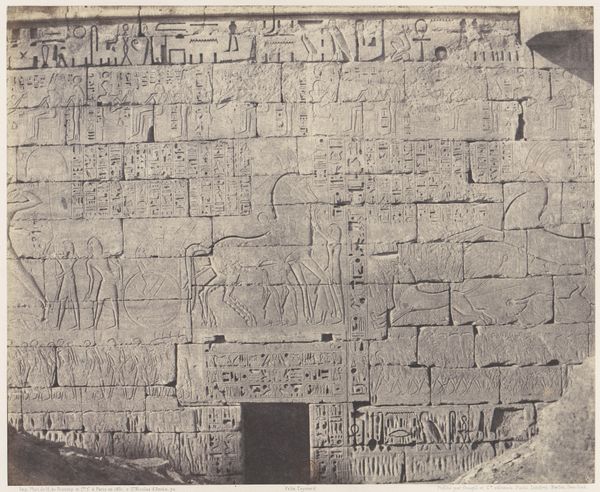 Editor: This photograph by Félix Teynard, taken between 1851 and 1852, captures a section of sculpted wall at the Karnak temple complex in Thebes. It's incredible to see the detail preserved in this image! What strikes me is how the relief seems both ancient and strikingly modern due to the sharp shadows. What do you see in this piece, beyond the aesthetic appeal? Curator: This photograph allows us to consider the materials and labor involved in both the creation of the original relief and the subsequent photographic documentation. The stone itself speaks of the society that quarried, carved, and erected it. Teynard's photographic process—likely involving paper negatives and albumen prints—adds another layer of materiality. How do you think the act of photographing this relief altered its meaning and accessibility? Editor: I hadn't considered that! It's easy to focus on the artistic intent of the relief, but the photograph brings in a whole new means of production. The ability to disseminate images like this to a wider audience, well, it definitely democratizes art. Do you think this also changes the *value* of the object itself? Curator: Precisely. The value shifts from solely being a sacred object or royal declaration, accessible to a select few, to becoming a historical and artistic artifact that could be studied and consumed by a European audience, influencing everything from academic scholarship to interior design. Think of the resources needed to travel and create those photos at that time! Editor: It's fascinating to think about how both the original relief and the photograph are products of their own material and social contexts. Curator: Exactly! We begin to unravel the layers of labor and consumption embedded within the image. Looking closely at its texture reveals processes, ideas, and values that are very relevant still today.