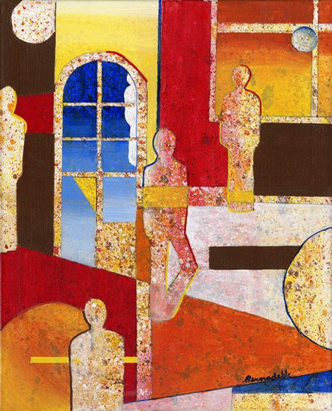 Aleksandr Borodin made this 60 by 55 cm piece, called 'Who, What', with... well, I'm not totally sure, but there's something about that surface that feels like oil on canvas. Look at that central figure – it’s like a philosophical clown, split right down the middle with a face for every emotion, maybe. The way Borodin layers those greens and reds, it's not just color; it's a conversation, a question hanging in the air. What's so striking is the texture, a smooth, almost dreamlike surface, yet those drips of green on the left side of the clown's face feel like a crack in the facade. It reminds me of de Chirico's dreamscapes. Both artists create these bizarre, unsettling worlds. We might not get all the answers, but maybe that’s the point. Art isn’t about solving a puzzle; it’s about living in the question.