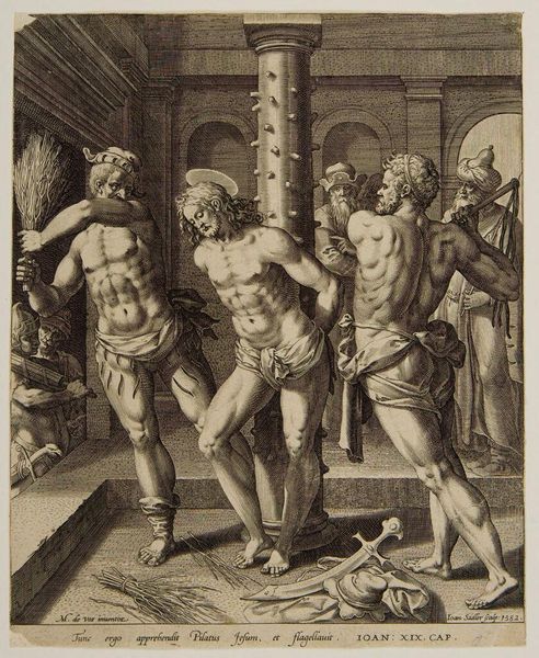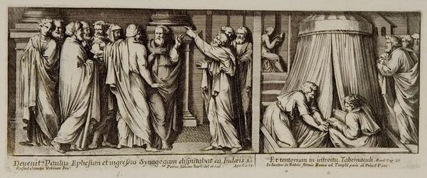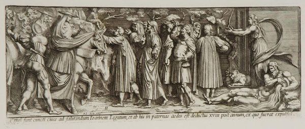 Curator: This engraving by Pietro Santi Bartoli, "Donation of Rome by Constantine; Judgment of Seleucus," presents two scenes brimming with social and political weight. What strikes you most about this pairing? Editor: The stark contrast, actually. One scene feels like a powerful ruler bestowing gifts, while the other looks like judgment and punishment. How do these images speak to each other? Curator: Consider the concept of power. The "Donation" alludes to the controversial transfer of authority, a potent symbol of the Church's ascendance. The "Judgment" scene, however, reveals the volatile nature of justice and public opinion. Editor: So, you're saying Bartoli is questioning the foundations of power itself? Curator: Precisely. He invites us to examine how authority is constructed, maintained, and challenged within different societal structures. What does it mean for power to be "donated" versus "earned," or even "imposed"? Editor: That’s a fascinating perspective. I hadn't considered how relevant these historical scenes are to contemporary debates about power dynamics. Curator: Indeed, Bartoli prompts us to critically evaluate the enduring legacy of these power structures. Editor: This makes me see the print not just as history but as a commentary on enduring social issues. Thanks!