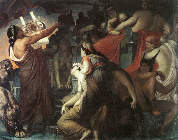 Editor: This oil painting, "Christian Martyrs in the Colosseum" by Konstantin Flavitsky, depicts a scene of obvious distress. The muted colors and crowded composition create a palpable sense of chaos and suffering. What stands out to me is the use of light and shadow to emphasize the emotional intensity of the figures. How do you interpret this work? Curator: Flavitsky captures the moment where faith and fear collide within the arena's embrace. Observe how the cross, a beacon of salvation held aloft, cuts through the darkness. It is an iconic emblem juxtaposed with the terror etched on faces. Consider the figures recoiling, arms raised in defense – a primal response to persecution. Do you see how their gestures echo the broader cultural memory of early Christian martyrdom, their suffering transformed into a symbol of enduring belief? Editor: I do. It's as though their physical gestures, born of immediate fear, become part of a larger, timeless narrative about faith. Curator: Exactly. Each element – the downward gaze, the clutching hands, the upward reach – contributes to the psychological weight of the scene. The figures mirror a universal struggle, don't they? Not just their personal anguish, but the ongoing conflict between belief and oppression reflected across centuries of history, ritual and practice. It begs the question, doesn't it? How has this narrative, encoded in images like these, shaped our own cultural identity and our understanding of sacrifice? Editor: This makes me think about how visual symbols, like the cross, or even the averted gazes, persist as ways of understanding shared traumas. It adds so many layers to the painting. Curator: Indeed. The painting becomes more than a historical record; it's a mirror reflecting our own understanding of courage and vulnerability. We can't ignore how these visual cues inform and shape our cultural memory.
