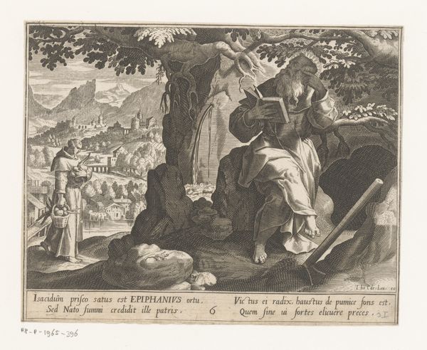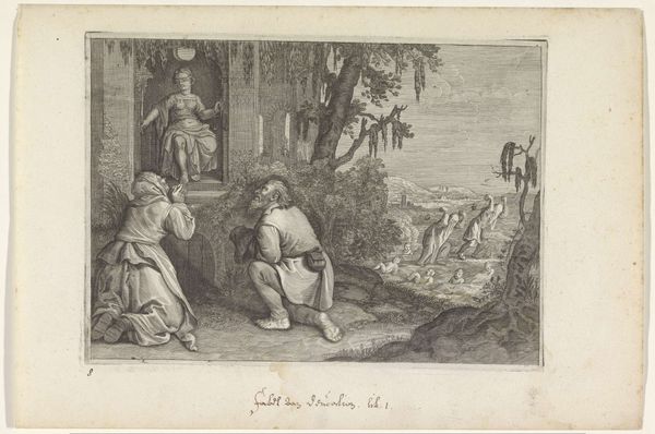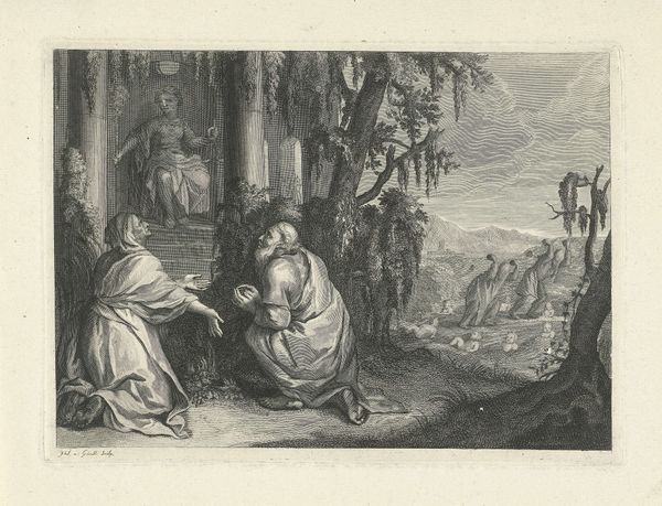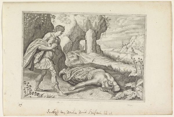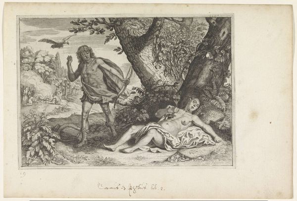 Editor: Here we have "Pyramus and Thisbe," an engraving by Magdalena van de Passe, dating from around 1636 to 1670. It depicts a tragic scene with striking detail; the emotion feels quite raw. What stands out to you in this work? Curator: The recurring image of the lion is especially captivating, carrying immense cultural baggage. In ancient mythology, lions often embodied untamed passion, strength, and also primal danger. Its presence here, coupled with the bloodied veil, becomes a potent symbol for the lovers’ impetuous desires and the brutal consequences that followed. Consider how often we see similar symbolic juxtapositions in art history. Why do you think these symbols resonate so deeply with us, even today? Editor: Is it because they tap into some shared unconscious understanding of these concepts across time? Curator: Precisely. It is as if certain images become hardwired into our collective cultural memory. Think of the image of the fountain. Is it merely decorative here, or does it amplify the theme of grief and catharsis? Editor: Well, the fountain has putti carved on it, which seems a bit ironic considering the lovers' tragic fate, right? Curator: Yes, the presence of Cupid is notable. Doesn't the iconography contrast vividly with the grim scene unfolding before it? It is as if Van de Passe wants us to question the perceived harmony and justice of love. We still read and connect to those symbols of loss centuries later. What new appreciation do you have for the print after further examination? Editor: I see the lion not just as a scary beast, but as a metaphor for dangerous passions and a dark premonition of the tragedy. It adds a richer layer of meaning to the whole scene.