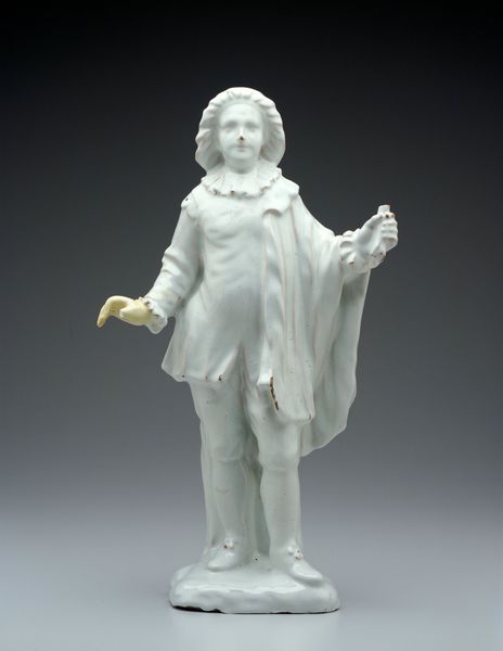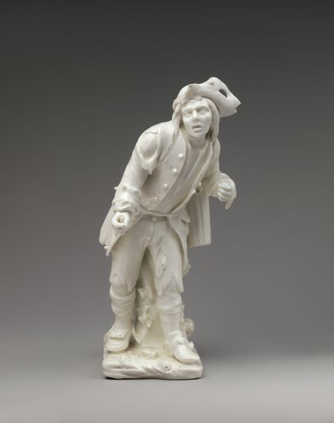 Editor: We’re looking at “Lord Lyndhurst,” a porcelain sculpture made sometime between 1824 and 1835, probably by Samuel Alcock & Co. It’s surprisingly... stiff. The all-white ceramic and formal pose make it feel almost like a monument in miniature. What can you tell me about why someone would create something like this? Curator: It's intriguing how you observe the sculpture's stiffness. Consider the historical context. The early 19th century saw an increasing interest in celebrating public figures, and simultaneously in a shift from aristocratic patronage to a burgeoning middle-class market for art. How do you think the production of portraits in ceramics serves those forces? Editor: I guess making porcelain figures was a way to make portraits accessible to a wider audience beyond oil painting for the wealthy? But was it purely celebratory? Curator: Certainly. Although we tend to interpret portraiture in search of interiority or individual likeness today, early 19th-century portraits were, very explicitly, concerned with power, social status, and the perpetuation of a certain visual rhetoric of authority. Note the figure’s clothing: the judicial wig, the voluminous robes… They speak volumes about Lyndhurst’s profession and position. The neoclassical style also lends him an air of timeless authority, connecting him to the traditions of Roman jurisprudence. Does the crisp whiteness contribute, do you think? Editor: That makes sense! The whiteness now strikes me as a deliberate attempt at communicating purity and prestige. I hadn't thought of the Neoclassical link, either, but it’s clearly referencing something far grander than just one person. Curator: Precisely. What seems like stiffness to a modern viewer was once understood as dignity and self-control – highly prized social virtues. I believe, also, this type of objects demonstrates the shift in the society. Who could become a model to the public? Editor: I see what you mean! Thanks, now it seems much more than a stiff little figure.
