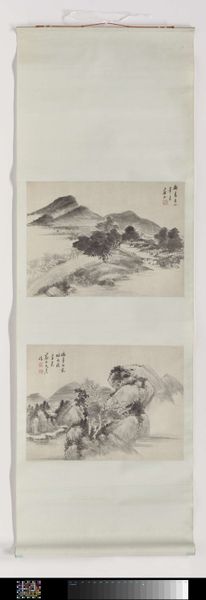 Editor: So, this is a hanging scroll, "Rolschildering in de stijl van de vier Wangs," dating back to 1897, created using ink and watercolor. It's incredibly detailed and atmospheric. What strikes me is the emphasis on the landscape, but I am curious about its creation and impact. What stands out to you when you look at this piece? Curator: What I see is an intriguing interplay between artistic tradition and the means of its reproduction. This scroll claims to be 'in the style of the Four Wangs,' emulating their techniques and aesthetic, but done in 1897. What does that tell us about the market, the desire for these landscapes, and the labor involved in essentially replicating a revered style? The materials, ink and watercolor, become tools for participating in this cultural economy. Editor: So, it's less about the specific landscape depicted, and more about the act of creating art within an established framework? Curator: Precisely. Think about the physical labor required to produce something like this in 1897 – grinding pigments, preparing the paper, mastering brushstrokes. Each action is rooted in a specific social and material reality. What purpose did these reproduced ‘historic’ paintings play in the culture of the late 19th century? How was painting becoming a commodity through workshops and skilled laborers? Editor: That’s fascinating. It shifts the focus from artistic genius to a question of production and cultural consumption. This prompts me to see the work as a statement about art making as an industrialized process, but using historically accurate craft. Curator: Absolutely, and that's precisely what a materialist perspective encourages us to consider. It's about unpacking the social relations embedded in the very act of creation, rather than simply admiring the finished product. The act of "Rolschildering" in this way elevates "the style" beyond individual genius, making "the style" a kind of brand name in itself. Editor: That completely changes my perspective. I will think more about the circumstances in which a painting was created! Curator: And that helps us to truly understand art’s value. Thanks!