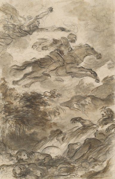 Curator: This dramatic forest scene, titled "Ein Eber von sieben Hunden im Wald bei einem Felsen gestellt," which roughly translates to "A Boar Confronted by Seven Dogs in a Forest Near a Rock," was created around 1750 by Johann Elias Ridinger. It’s a compelling work done with ink, chalk and indian ink on paper. Editor: It’s intense! The textures feel almost palpable; you can practically hear the dogs barking and the boar’s enraged snorts. The way he renders the undergrowth, and the rock... it all feels so raw and immediate. Curator: Ridinger was, of course, famous for his depictions of animals, particularly scenes of the hunt. Considering the era's aristocratic obsession with hunting, one could examine how images such as these might glorify domination over nature and affirm social hierarchies through symbolic representation. The artistic processes themselves reflect this pursuit – literally capturing the likeness of animals on the page. Editor: Absolutely. Hunting as a visual motif goes way back, right? There's a primal, even mythical quality here. Boars often symbolized untamed nature, strength, and even evil. Think of the Calydonian Boar in Greek mythology, or even medieval tapestries depicting boar hunts, these animals stood for formidable foes to be overcome, or embodiments of chaos to be purged. And, here, the pack of dogs adds another layer – they stand for loyalty, perhaps, but also the relentless pursuit of social order… even the light coming in from above has an almost allegorical function in creating two spaces or teams: boar and pack of dogs! Curator: Yes, and in terms of the materiality and labour, Ridinger's reproductive prints made his imagery widely accessible, catering to this market. The technical skill displayed is definitely part of the commodity, it's evidence of mastery that makes the object valuable. Editor: Though the rendering feels quite naturalistic, the symbolic weight gives it a life of its own beyond just documentary. I read it as more than just a boar hunt. Curator: Perhaps a visualization of power dynamics between social groups as they are acted out and naturalized through violent scenes of conquest. Editor: Or as representations of timeless conflicts, struggles embedded deep within our collective psyche. I find his choices around medium quite interesting, how charcoal and chalk blend together so softly... the lack of high contrast almost allows for more tension between the species. Curator: It seems our perspectives converge nicely around the complexity of the image! Editor: It does indeed; I find the piece incredibly compelling viewed from both a material and iconographic standpoint.