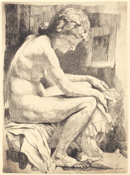 Editor: Here we have John Sloan's 1930 etching, *Nude on Stairs.* There's a definite domestic feeling to this scene – it feels very intimate. How would you interpret the compositional elements here? Curator: The network of hatching and cross-hatching in the etching produces a range of tonal values that coalesce to create depth and form. Note the spatial arrangement of the figure in relation to the staircase; its spiraling form, defined by strong verticals and horizontals, visually encloses the figure. Does this reinforce the feeling of domestic intimacy that you described? Editor: I think so. There’s almost a sense of enclosure or perhaps even being trapped in a domestic setting. The nude form is unexpected in this mundane, interior space. Curator: Indeed. The figure's nudity introduces a counterpoint to the mundane. The tension lies in the contrasting treatment of the figure and the setting. Note that while the background contains hard geometric forms, the figure seems fluid and softly defined, created from tonal modelling and suggestive outlines. Is there any reading that we can extrapolate from the relationship between these formal devices? Editor: It's interesting... the staircase confines her physically, but her intellectual escape, represented by the book, provides a means of departure, and I now see that this internal escape is underlined by the soft form. The domestic reality confines and contrasts with the free-flowing escape offered by the form. Curator: Precisely. And in paying attention to how these formal decisions influence the meaning of the piece, one gains access to richer interpretation of Sloan's aesthetic vision. Editor: I can definitely appreciate Sloan’s manipulation of the etching medium to evoke the emotional landscape.