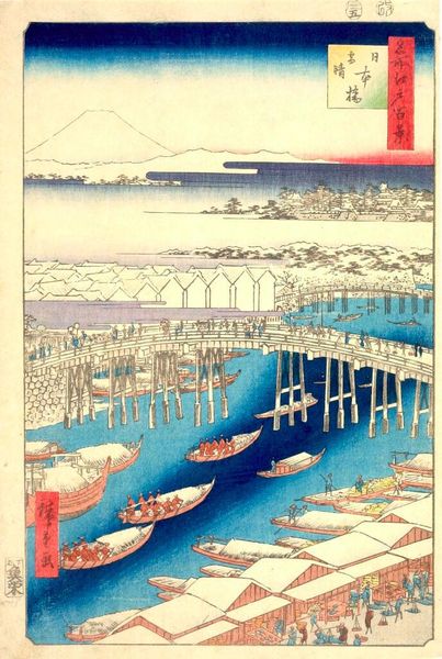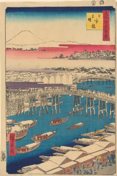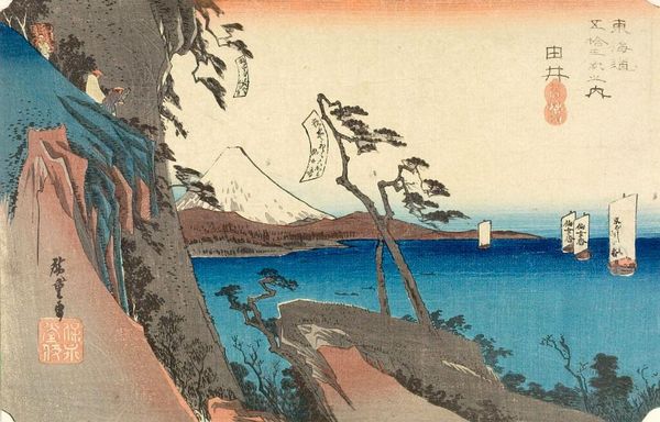 Editor: This lovely print, "Sunset Glow at Nojima" by Utagawa Hiroshige, looks to me like a scene of serene beauty. The water and sky seem to blend seamlessly. What do you see in this piece? Curator: The enduring appeal lies in how Hiroshige evokes a sense of longing. The boats suggest journeys, and the glowing sunset symbolizes endings, but also the promise of a new dawn. Do you see how the red sky contrasts with the blue sea, representing a duality? Editor: Yes, I see how the colors create a visual tension, and the boats do suggest a connection to something beyond the immediate scene. I hadn't considered the symbolism of the sunset before. Curator: Consider how Japanese art often intertwines nature with human emotion. This piece offers a glimpse into a world where every element carries symbolic weight. Editor: This piece invites contemplation about the cyclical nature of life and the beauty inherent in both endings and beginnings, I now see. Curator: Exactly. It’s a testament to the power of imagery and how symbols remain relevant through time.