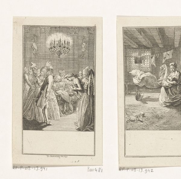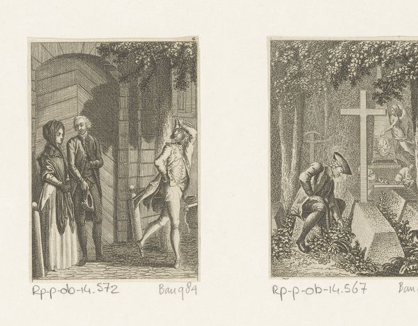 Daniel Nikolaus Chodowiecki created this small etching, Yorick naast het graf van de Franciscaner monnik, its date is unknown. The composition is dominated by a stark white cross, offset against the dark, dense foliage and monochromatic palette. The figure of Yorick, hunched and cloaked, is a study in grief, yet his posture introduces a dynamic curve that contrasts with the cross's rigid geometry. Chodowiecki uses the etching medium to explore themes of mortality and remembrance. The cross and tomb act as signs, marking the boundaries between life and death. Yorick’s presence invites us to reflect on the human condition, prompting us to question what lies beyond life's horizon. Note how the intricate network of lines creates a sense of depth, drawing us into the contemplative space of the graveyard. The stark contrast is not just a visual trick; it reflects a philosophical tension between presence and absence, certainty and doubt, challenging viewers to confront the ambiguous nature of existence.