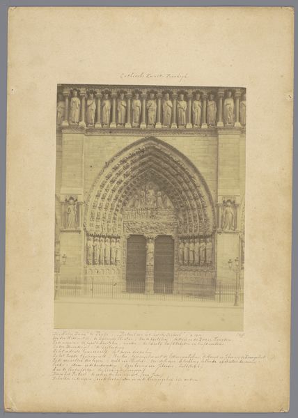 Curator: This gelatin silver print, taken sometime between 1875 and 1900, captures the upper portal of the Sainte-Chapelle in Paris. It's credited to an anonymous photographer. What are your initial thoughts? Editor: Austere, and strikingly balanced. The monochrome palette emphasizes the architectural form; it’s all lines and planes, directing my gaze upward toward the arched portal. Curator: The choice of this view emphasizes the Gothic Revival style of the building, drawing from its symbolic architectural heritage to assert spiritual authority, which carries significant cultural and psychological meaning here in the heart of Paris. Editor: I'm struck by the repetition of geometric patterns. The arcade above the entrance mimics the smaller arches framing the sculpture; this mirroring lends the composition a very pronounced symmetry. I wonder what that means here? Curator: Symmetry has long been associated with divine order and perfection. The repetition emphasizes the idea of heavenly harmony, reflecting an idealized world. Thinkers have argued about the meaning of religious architectural forms. Each repeating form works on the beholder to create a feeling. It brings you into that mental world. Editor: A point taken. And looking closer at the surface, I notice how the photographer uses light and shadow to sculpt the stone, really highlighting the three-dimensionality and texture of the facade. The technique draws me into considering not just the appearance of the image but the tangible experience of being there. Curator: Exactly! The print invokes both the tangible—the stone and construction of Sainte-Chapelle, as well as an enduring psychological experience associated with pilgrimage, or even cultural and national identity connected to Parisian culture, architecture, and design. The picture embodies both physical form and mental associations. Editor: For me, the photograph boils down to a study of form and texture rendered through the starkness of early photographic printing techniques, offering insight into how we understand three dimensions on a flat plane. Curator: Yes, but it is equally a portal to something more. It presents the spiritual significance of this structure to those engaging with it now, reflecting the enduring nature of shared belief and collective visual memory.